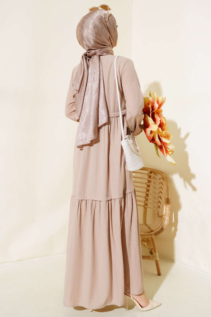 Boydan Düğmeli Kemerli Tensel Elbise Latte