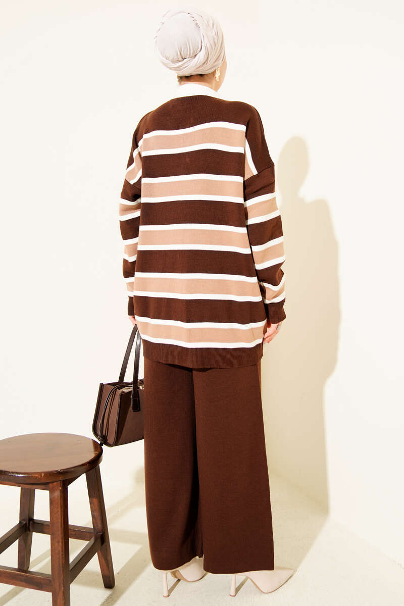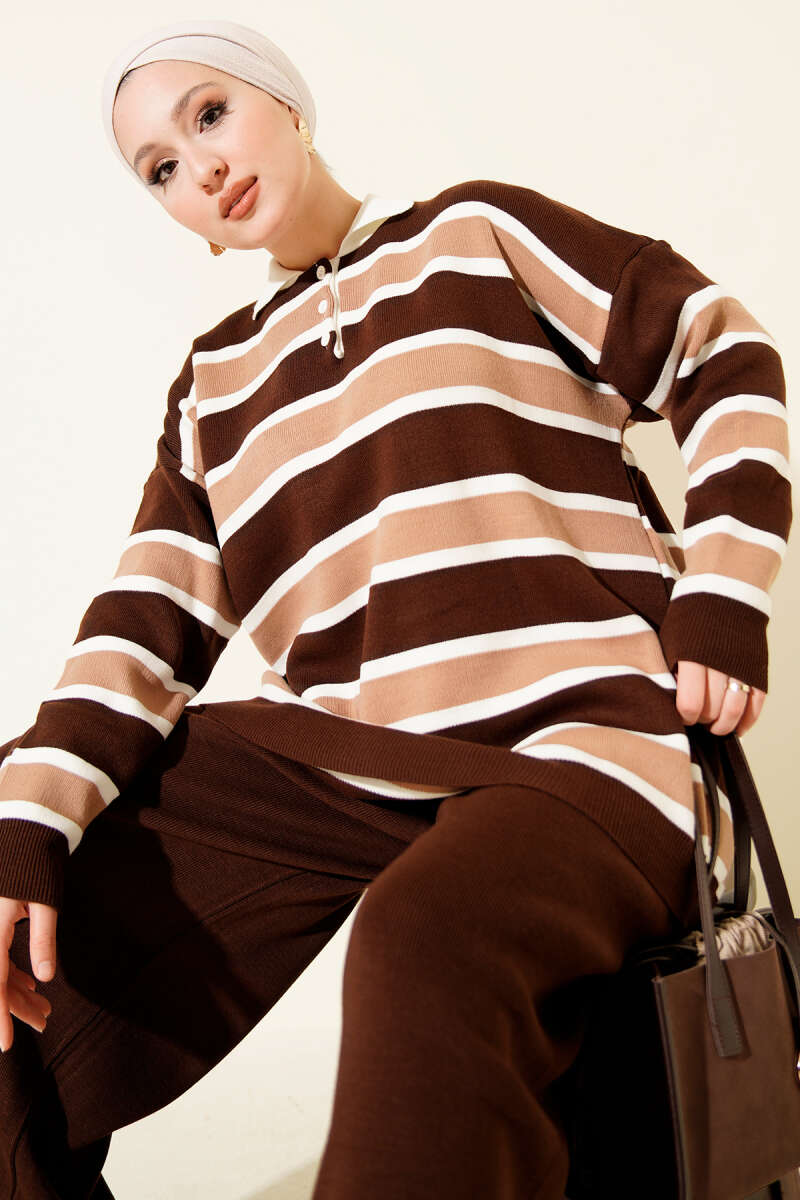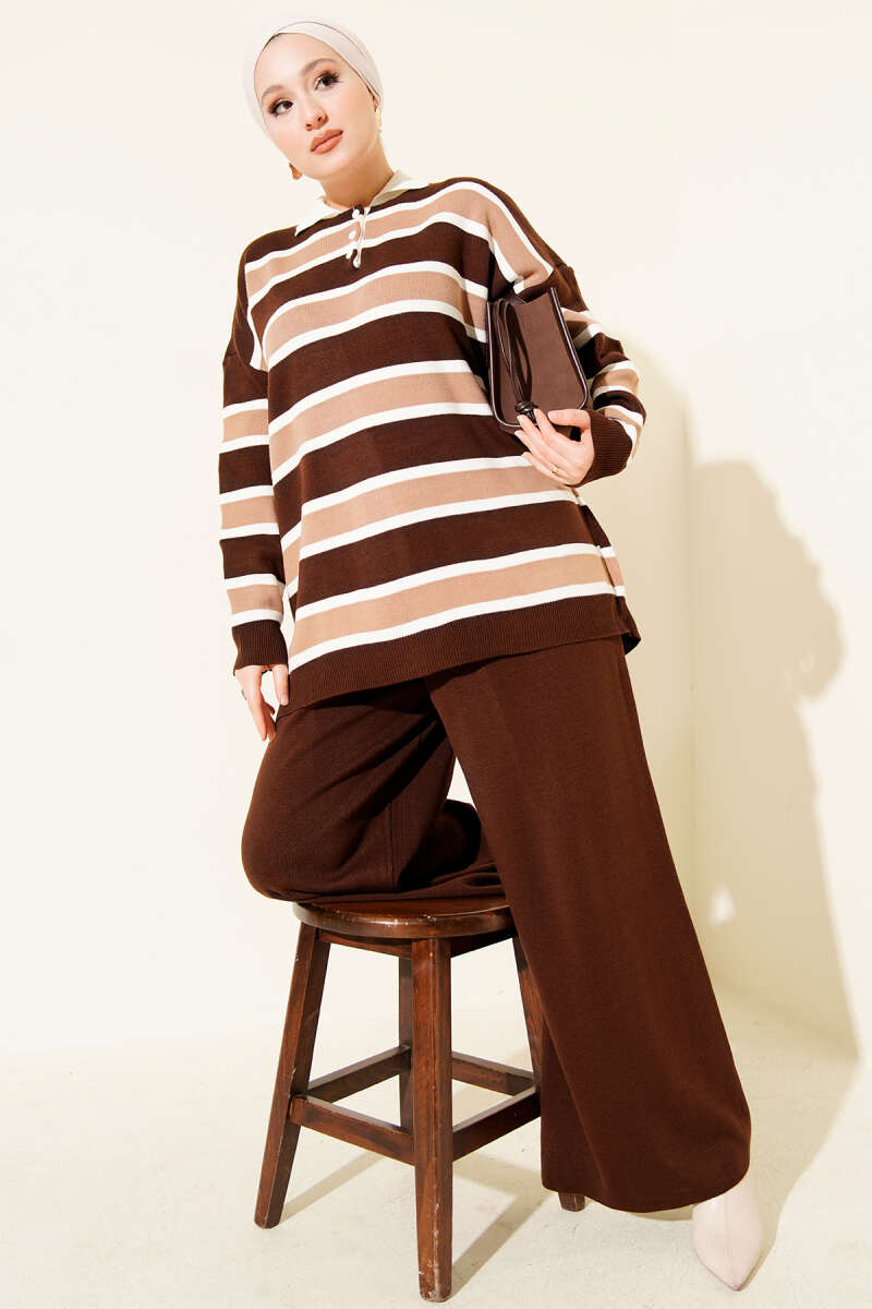 Gömlek Yaka Yatay Çizgili Triko İkili Takım Lacivert
