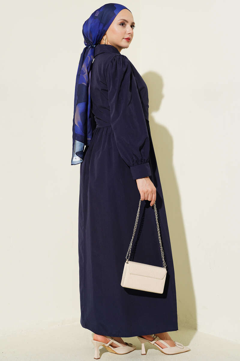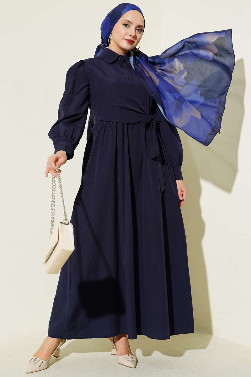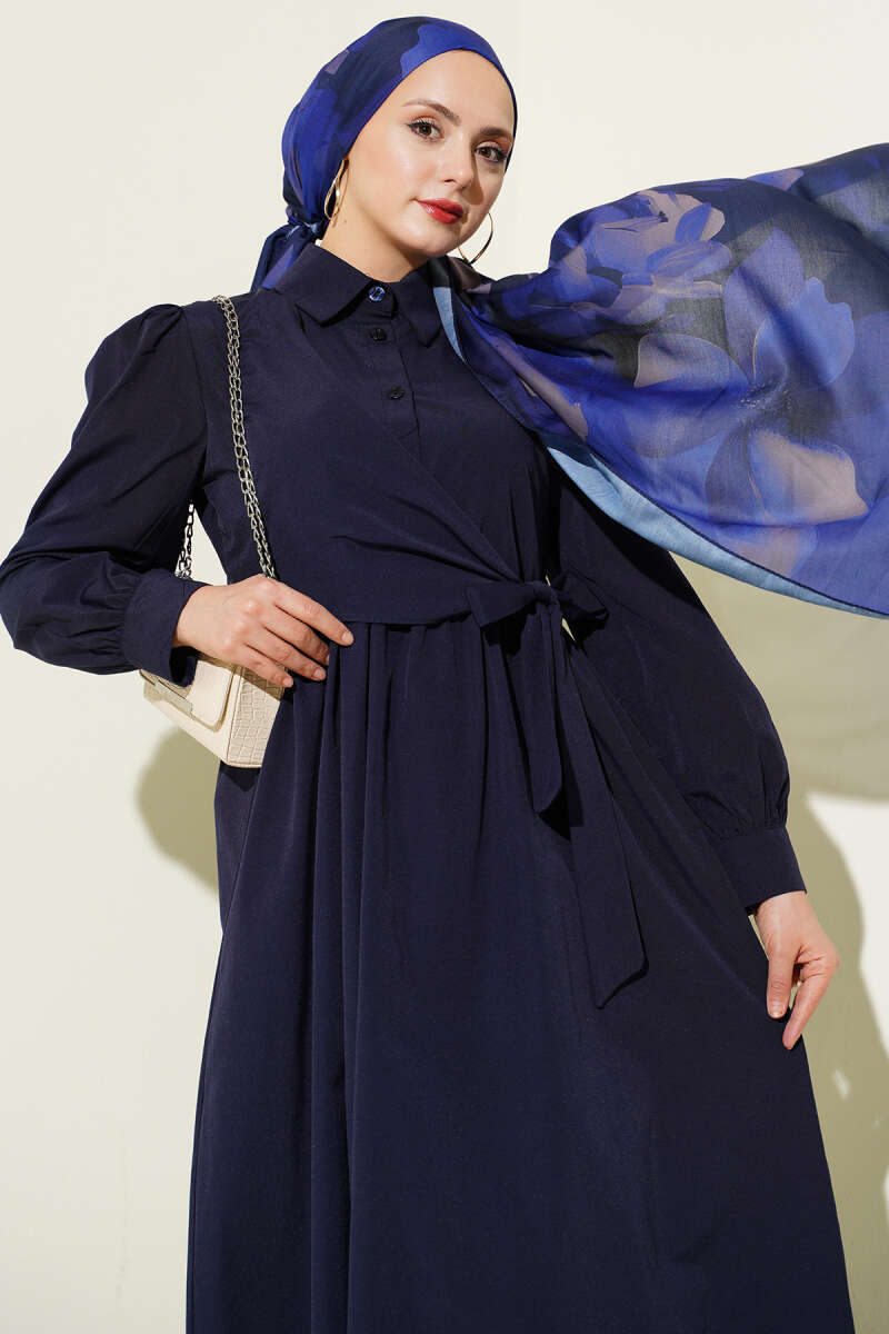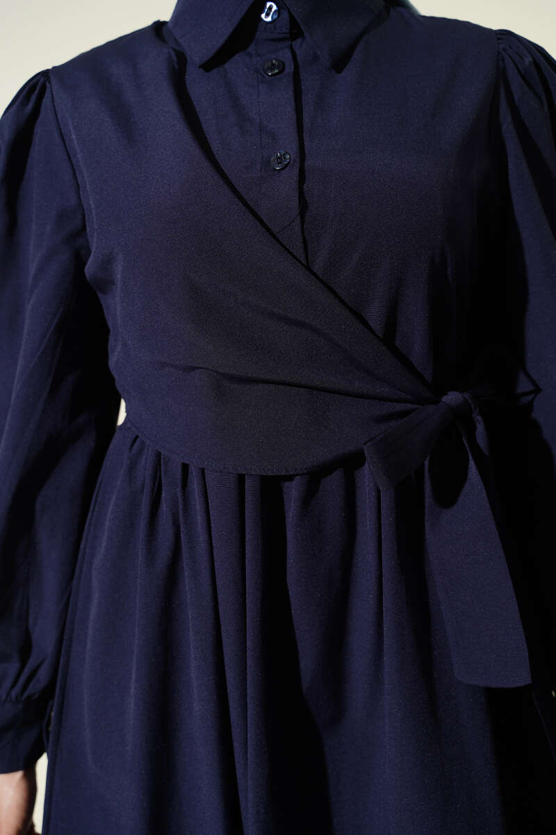 Gömlek Yakalı Yan Bağlamalı Elbise Lacivert