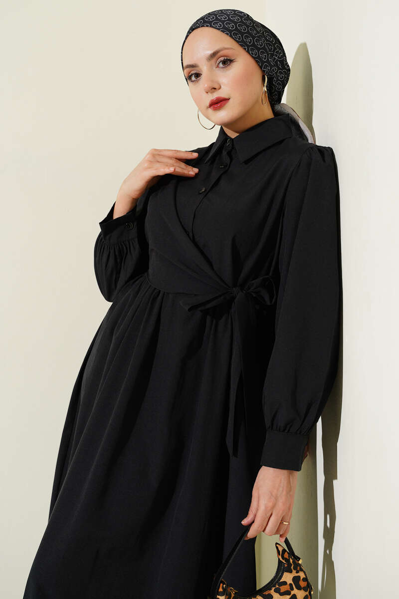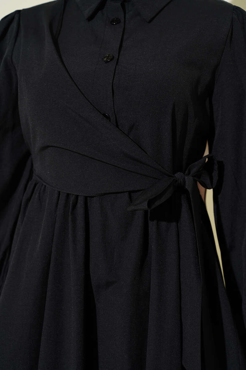 Gömlek Yakalı Yan Bağlamalı Elbise Siyah