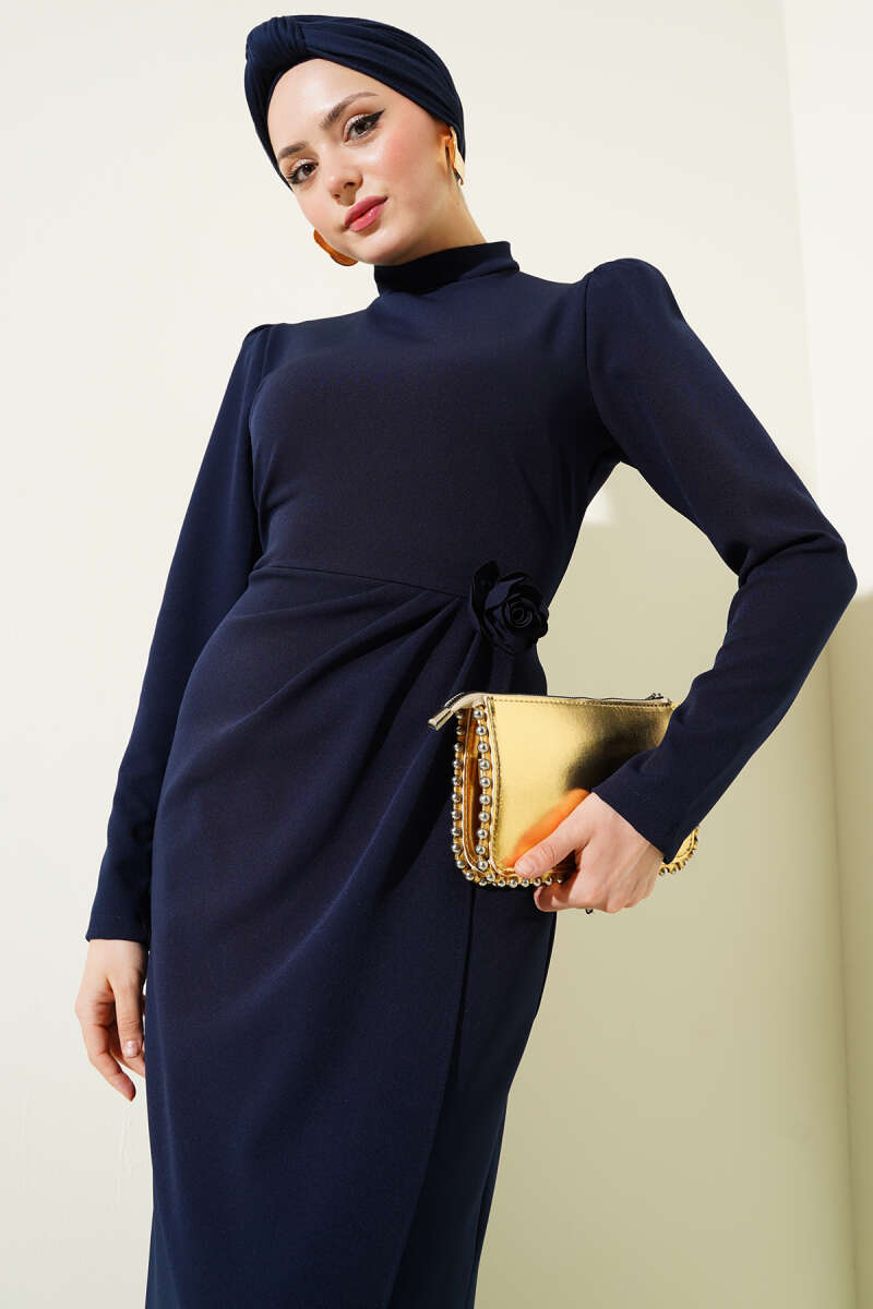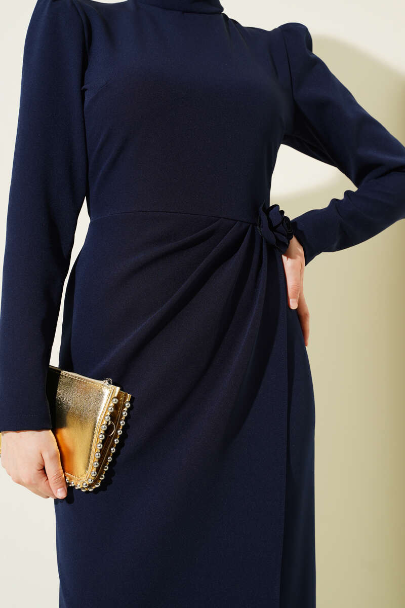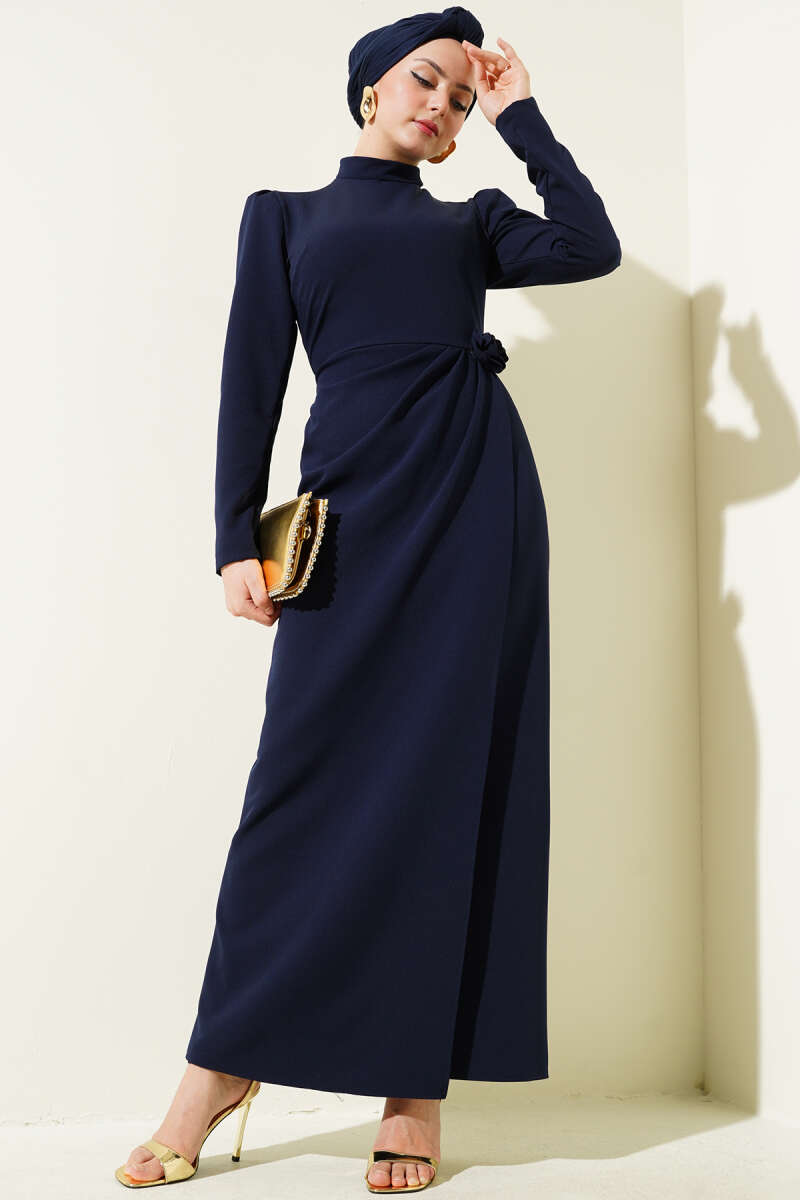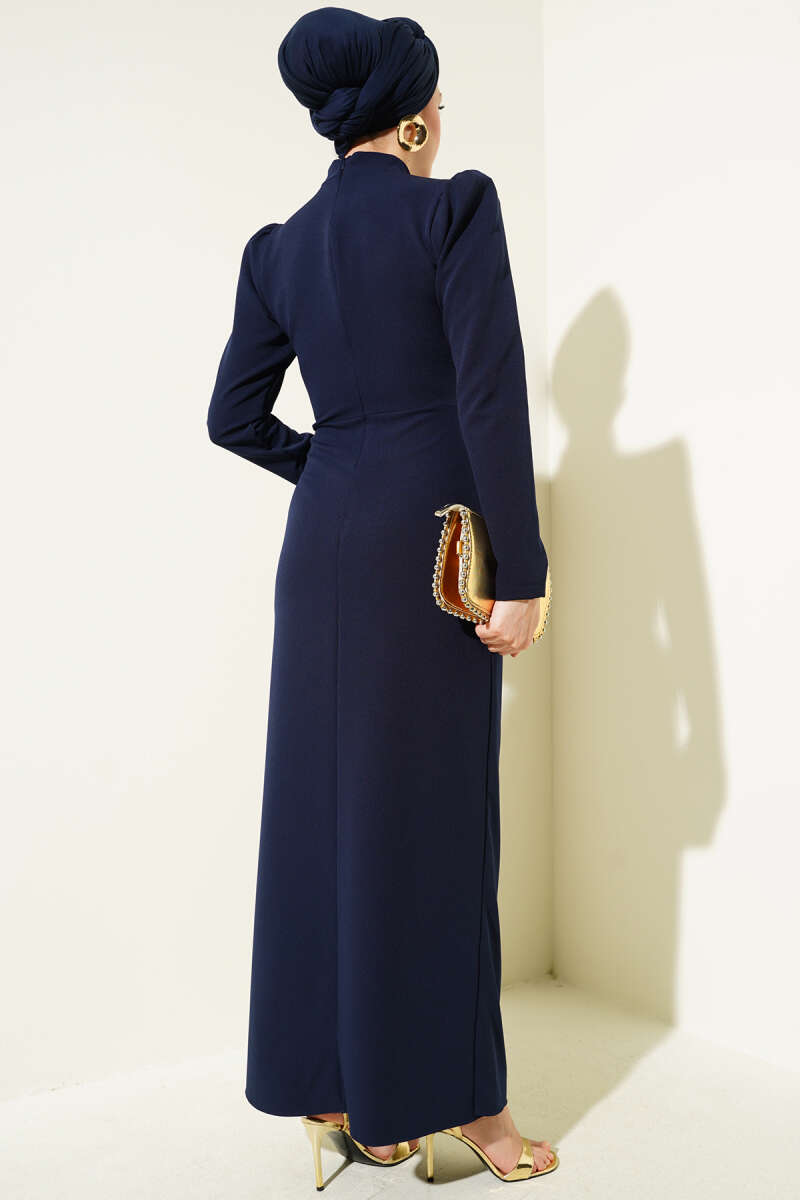 Bilek Bağlamalı Kuşaklı Abiye Elbise Lacivert