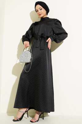 Kol Ucu Kürklü Fitilli Kaşe Elbise Siyah