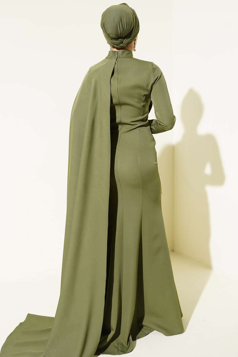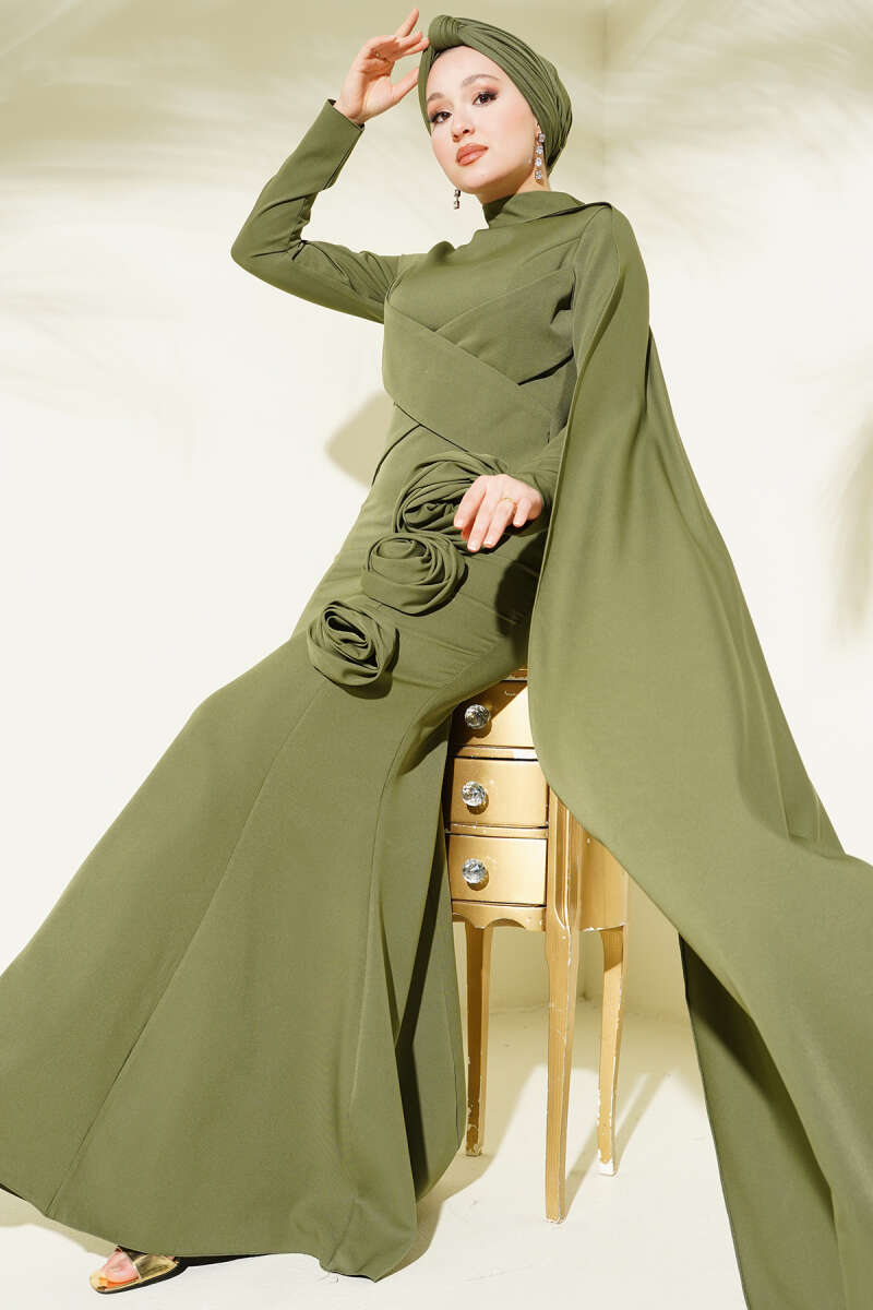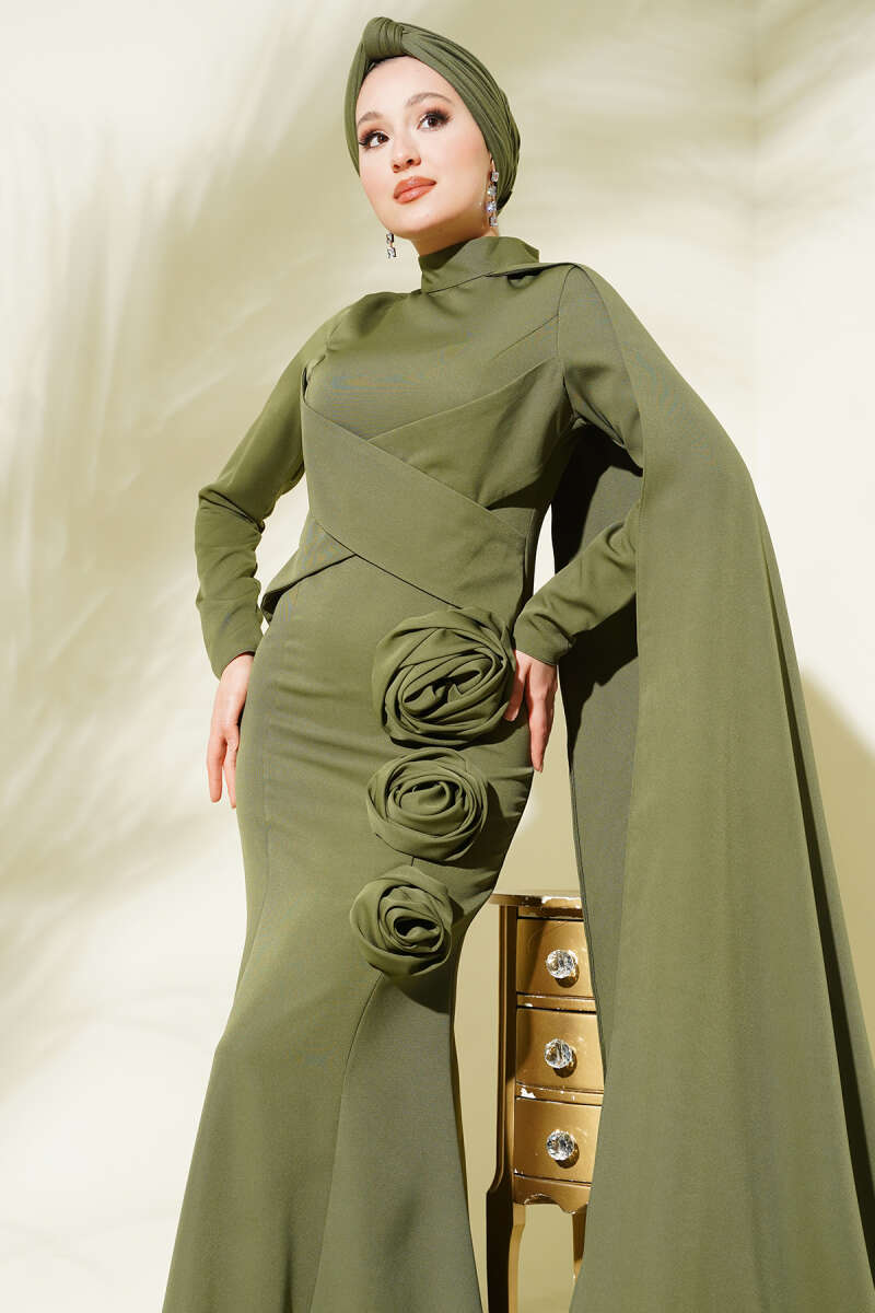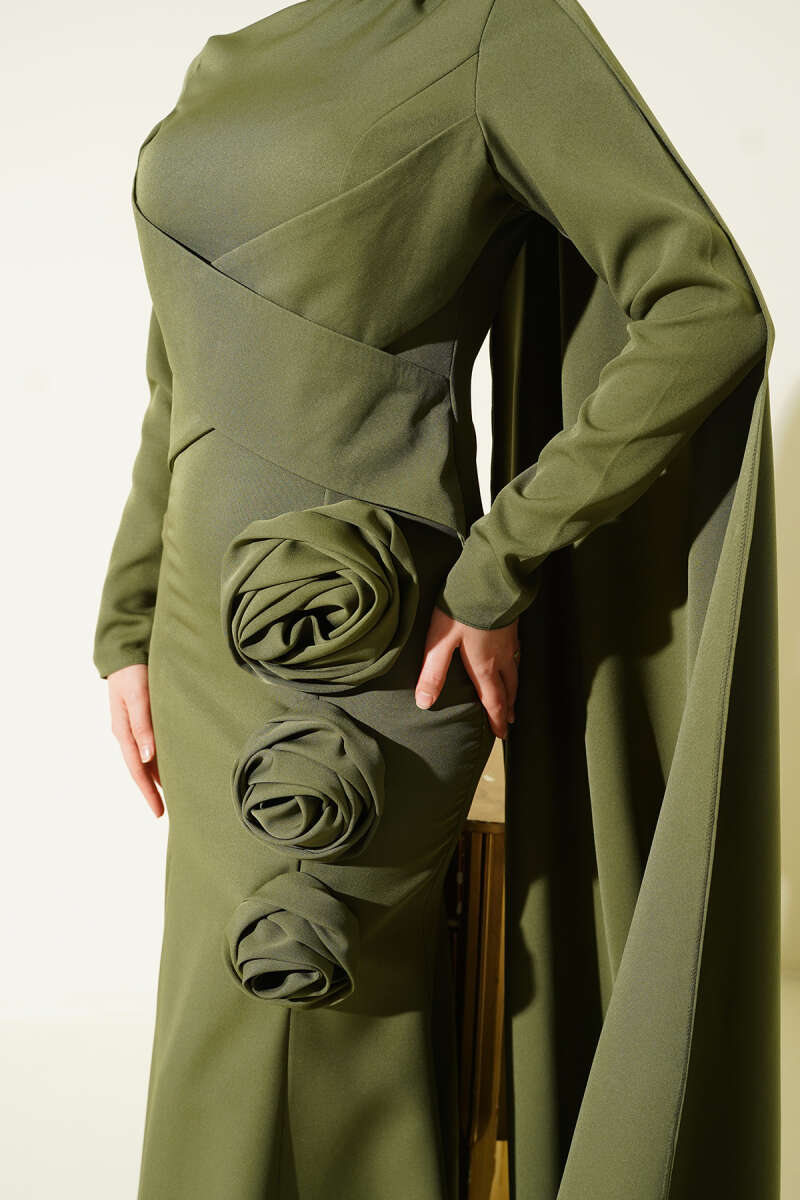 Gül Detaylı Pelerinli Abiye Elbise Haki