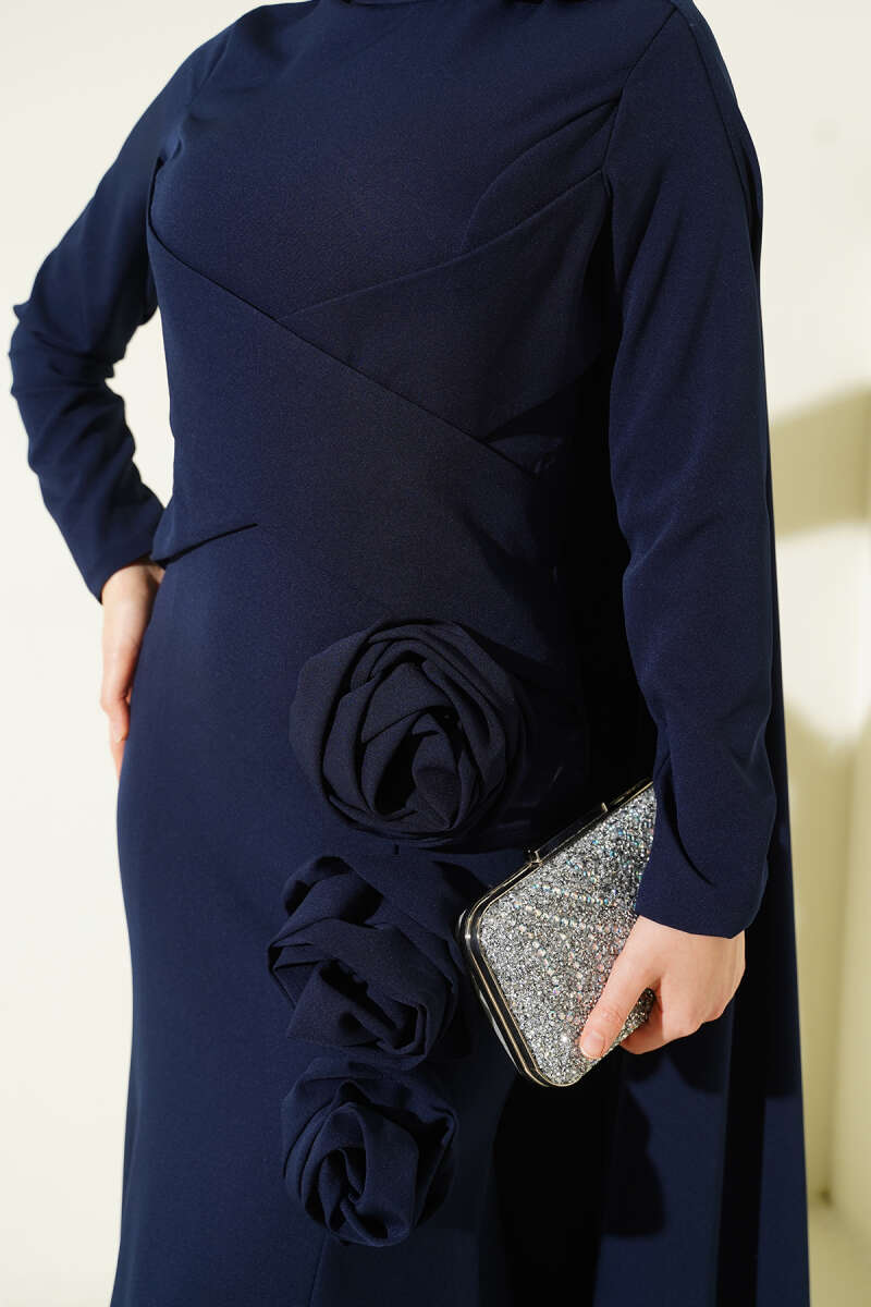 Omuz Pelerinli Taş Detaylı Abiye Elbise Lacivert