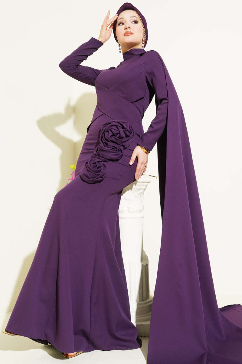 Gül Detaylı Pelerinli Abiye Elbise Bordo