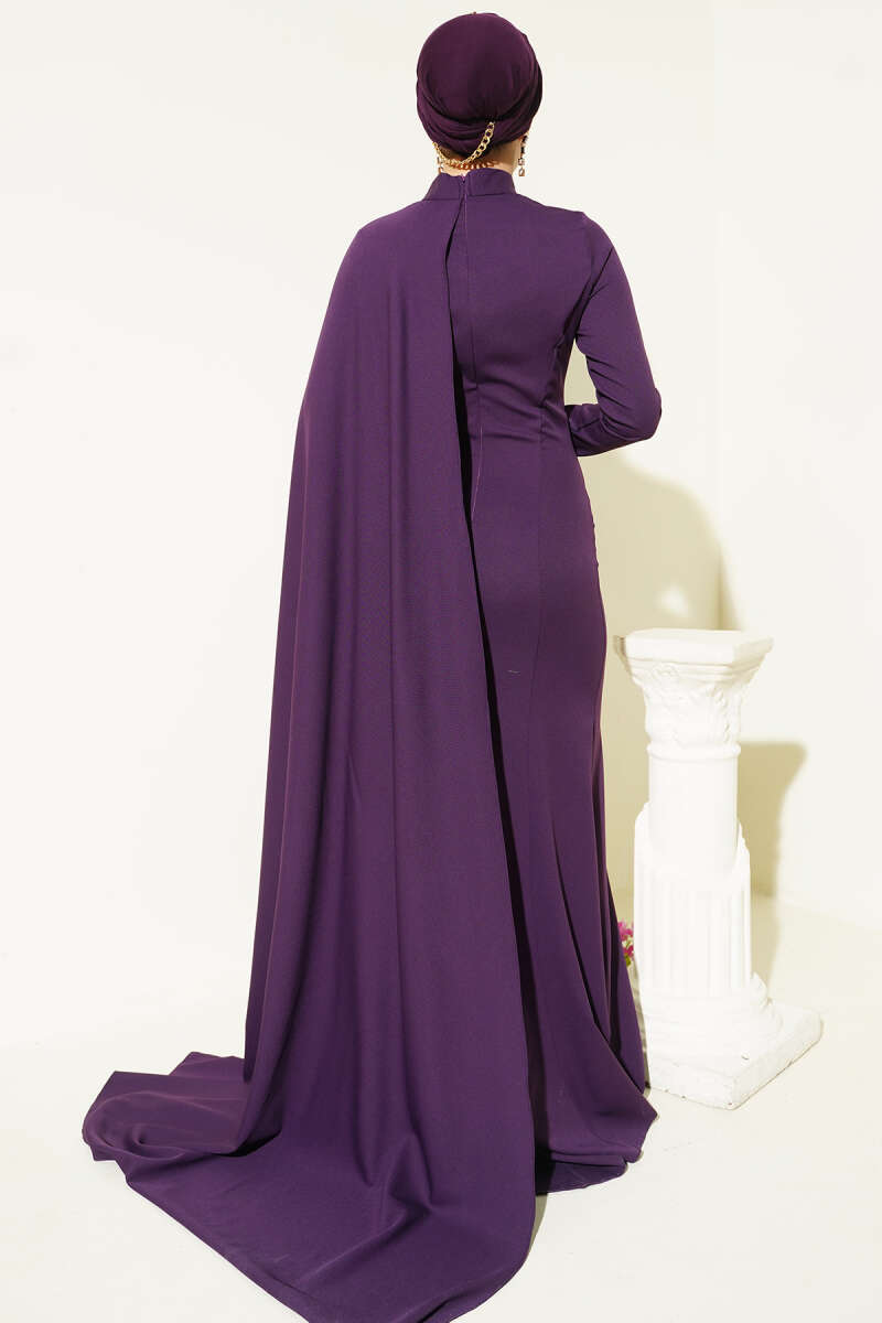 Omuz Pelerinli Taş Detaylı Abiye Elbise Bordo