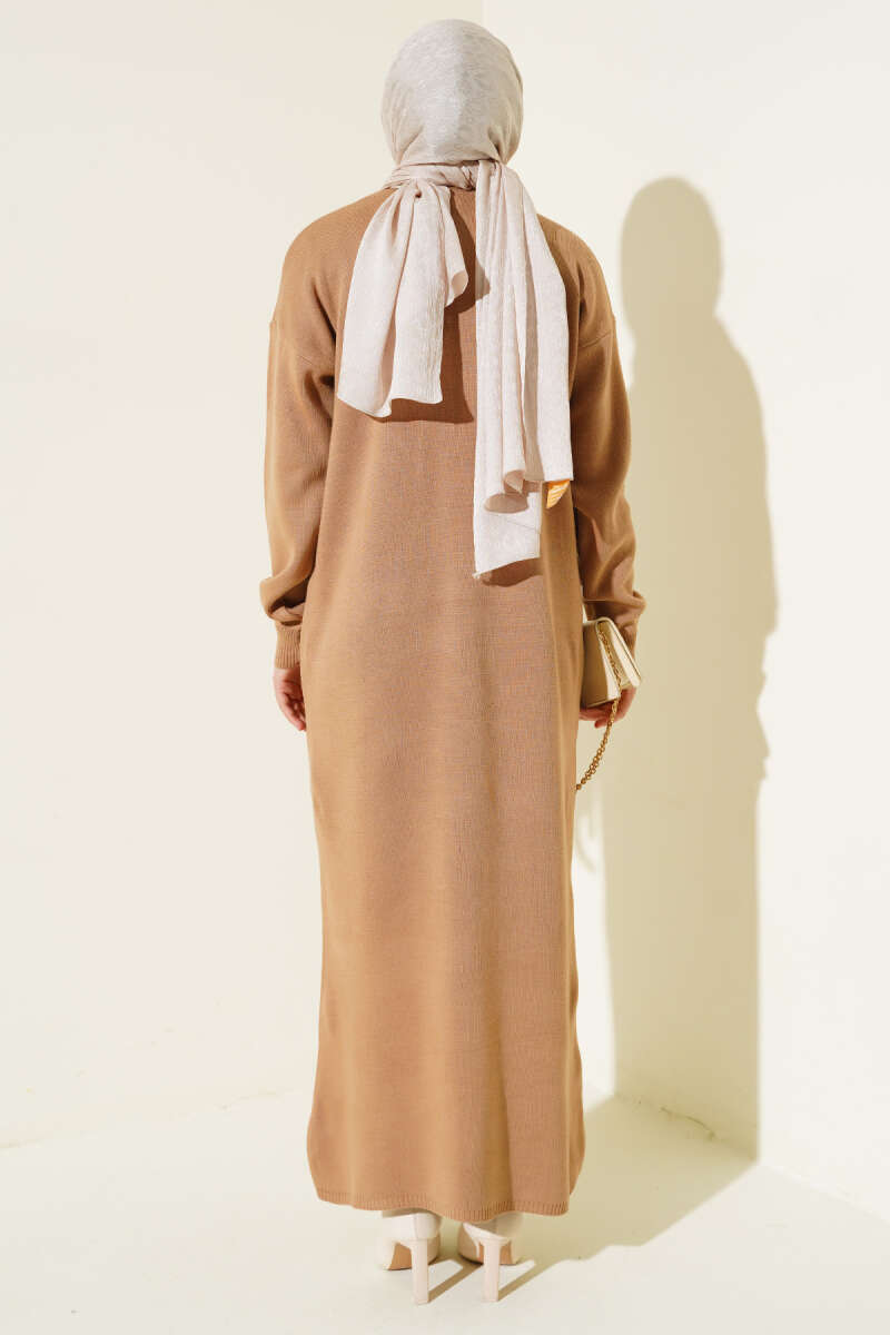 Önü Düğme Detaylı Triko Elbise Büsküvi