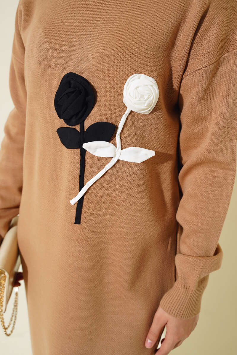 Çiçek Detaylı Yumoş Triko Tunik Lacivert