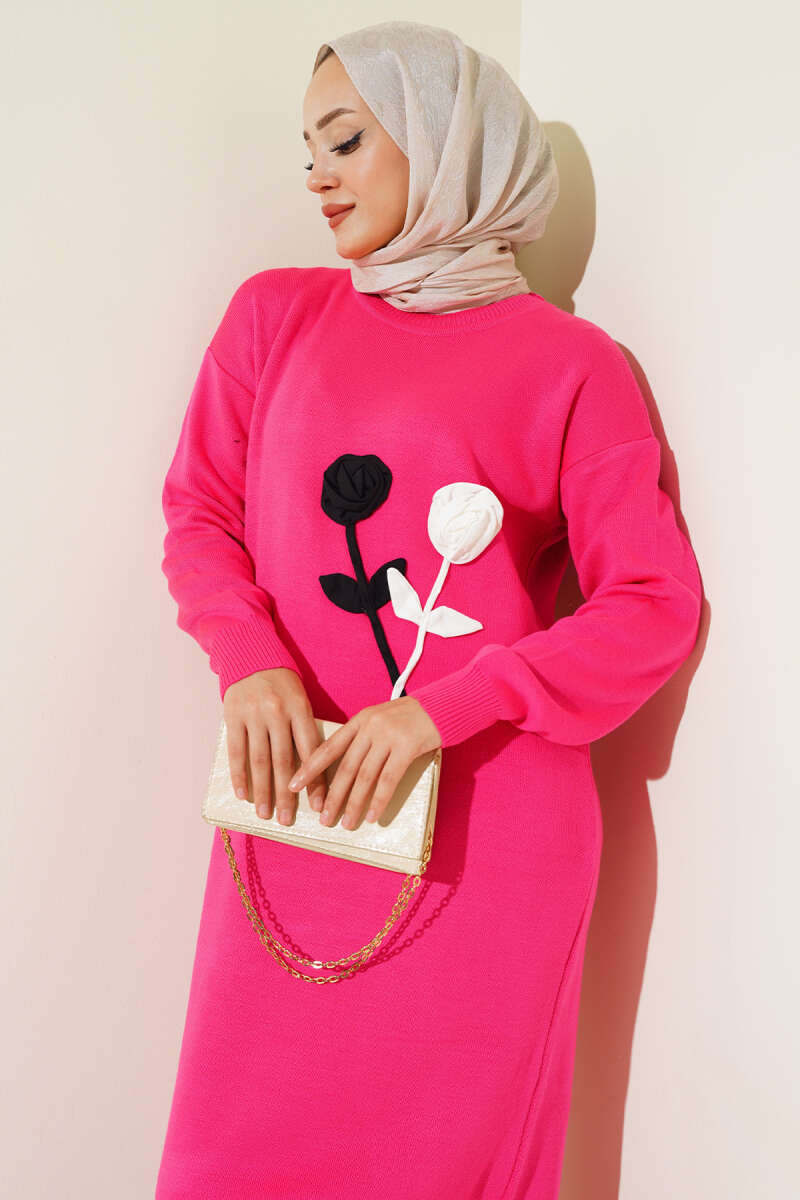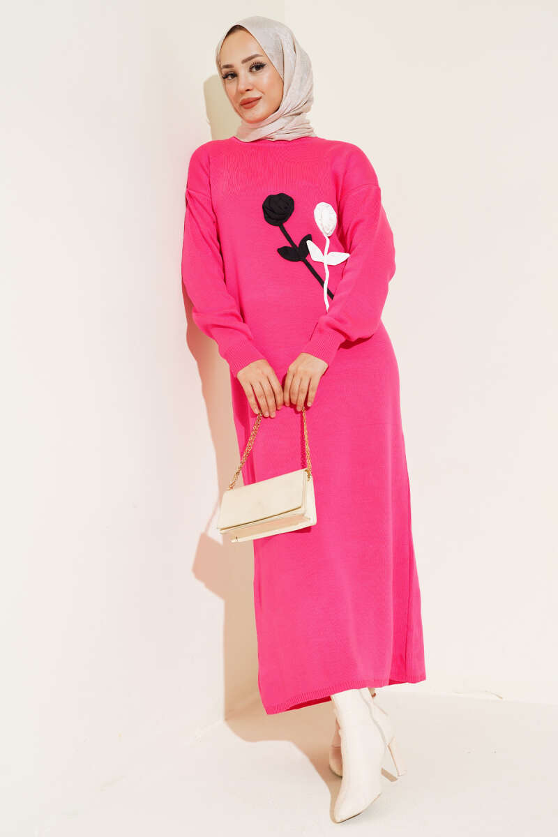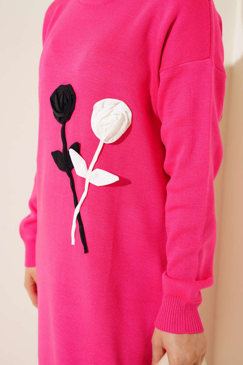 Çiçek Detaylı Yumoş Triko Tunik Lacivert