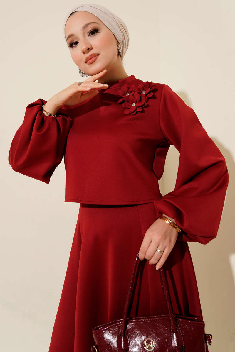 Gül İşlemeli Etekli İkili Takım Bordo