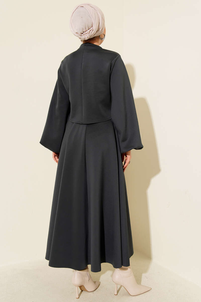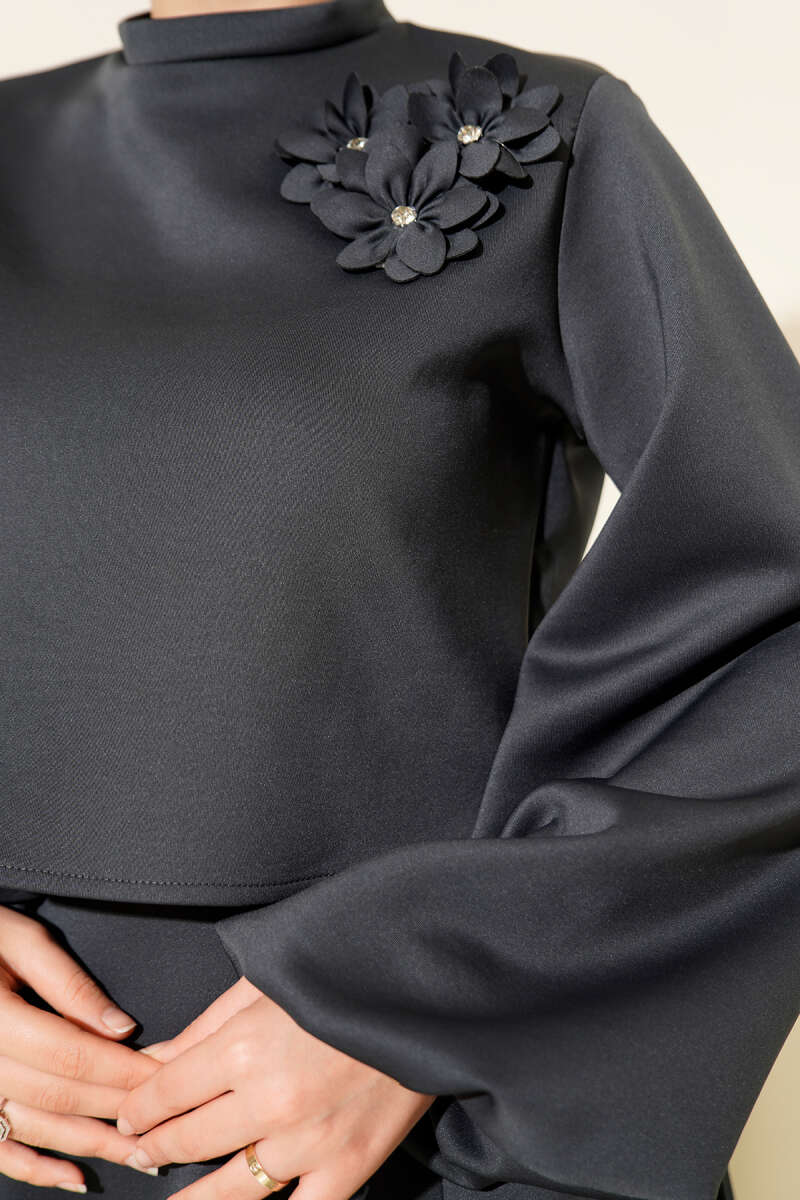 Gül İşlemeli Etekli İkili Takım Füme
