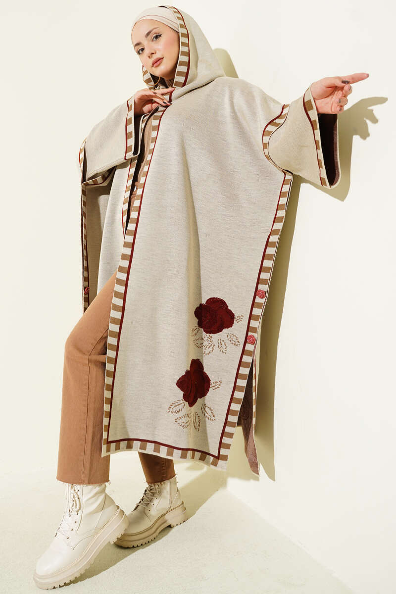 Çıtçıt Düğmeli Kapüşonlu Triko Panço Bej