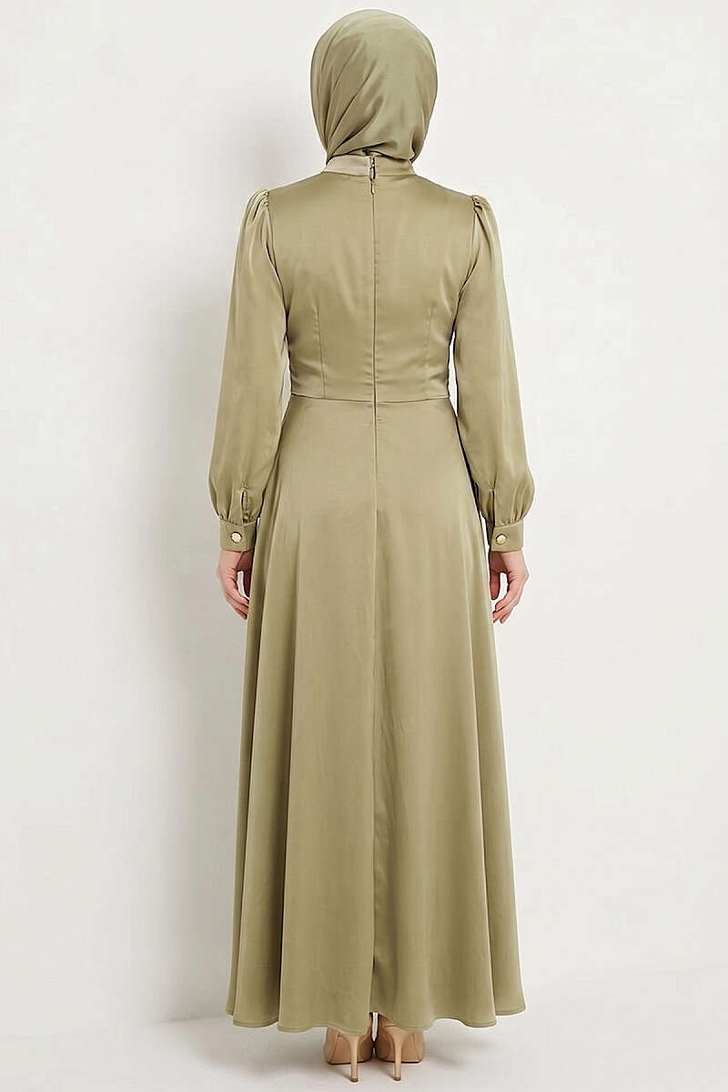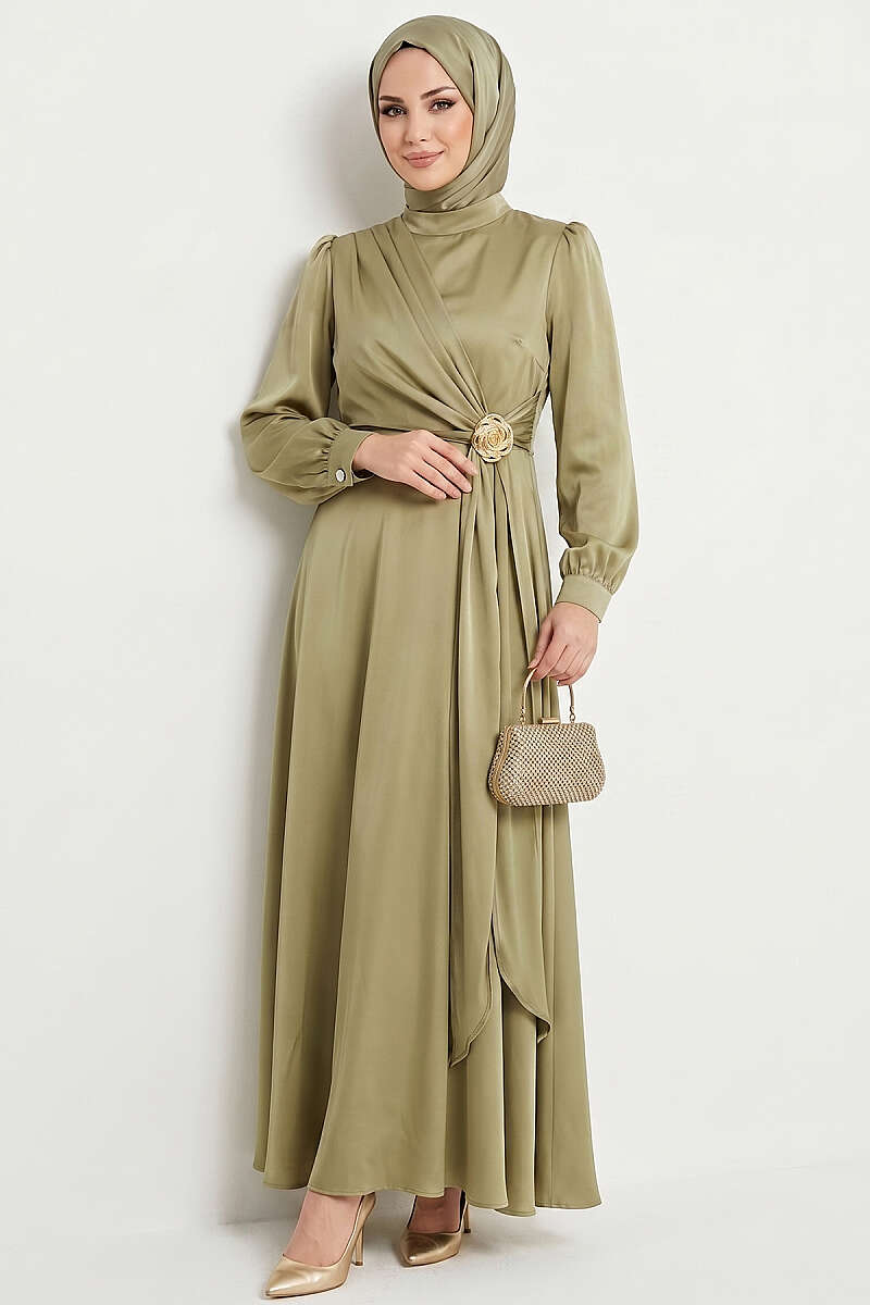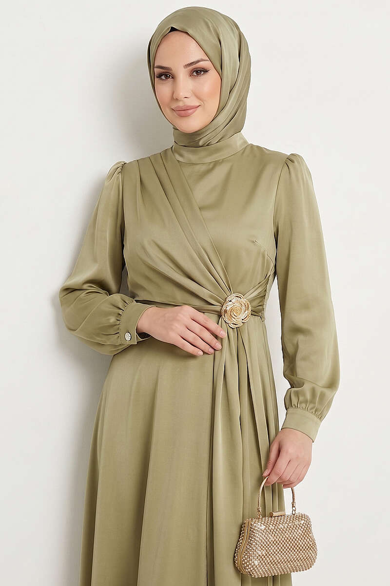 Gül Tokalı Saten Abiye Elbise Çağla Yeşili
