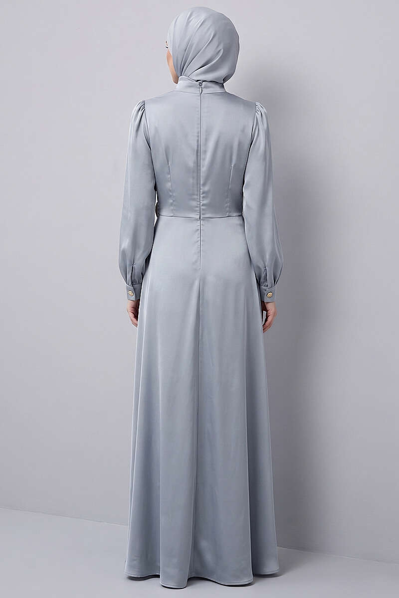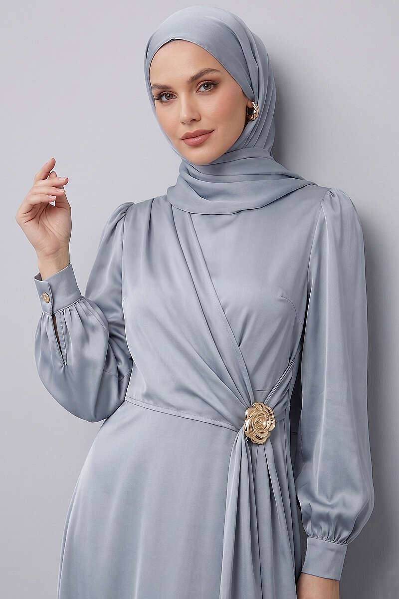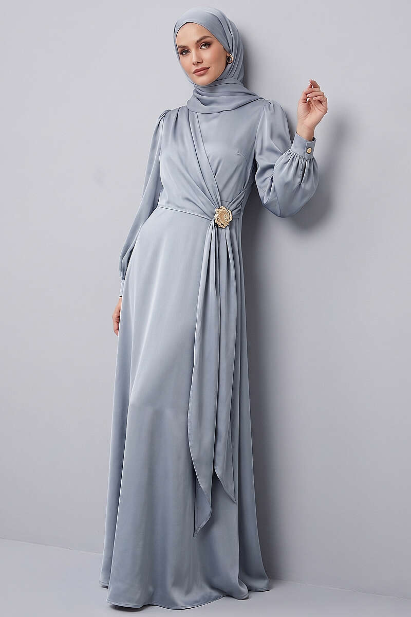 Gül Tokalı Saten Abiye Elbise Lacivert