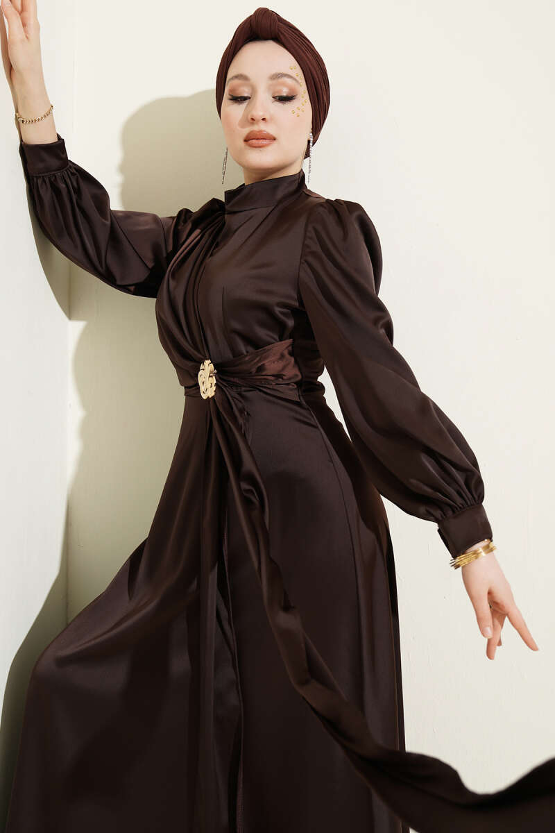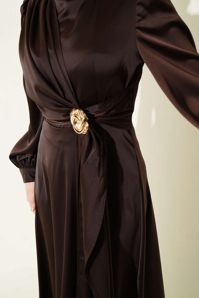 Gül Tokalı Saten Abiye Elbise Kahve