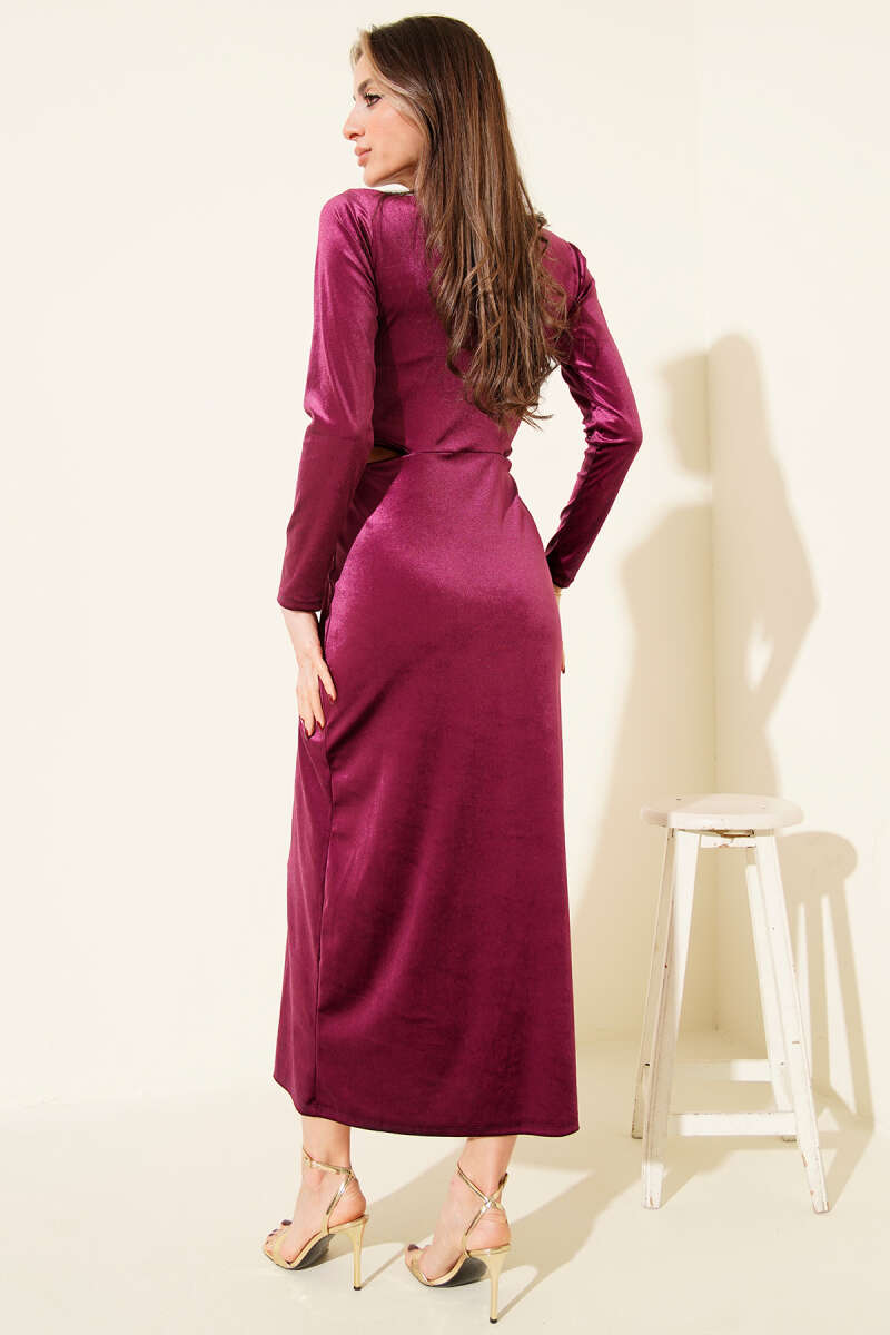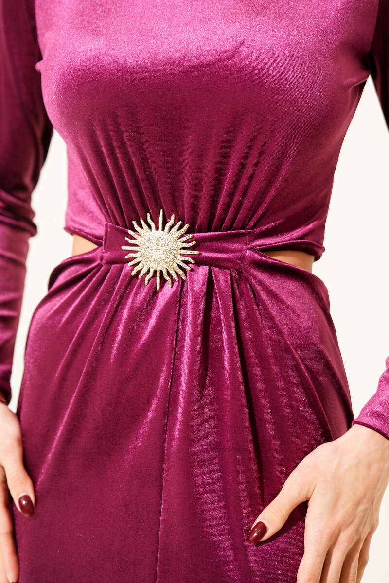Güneş Aksesuarlı Yırtmaçlı Kadife Elbise Mürdüm
