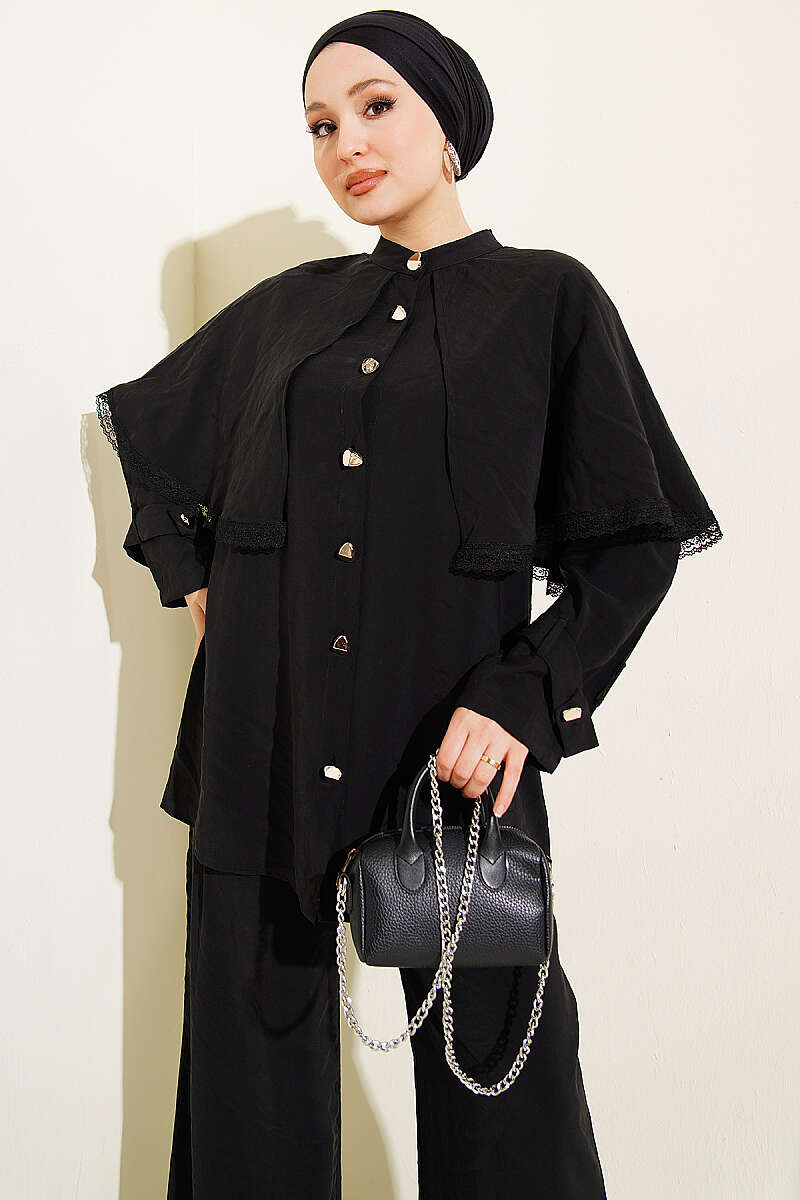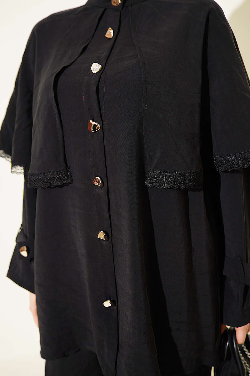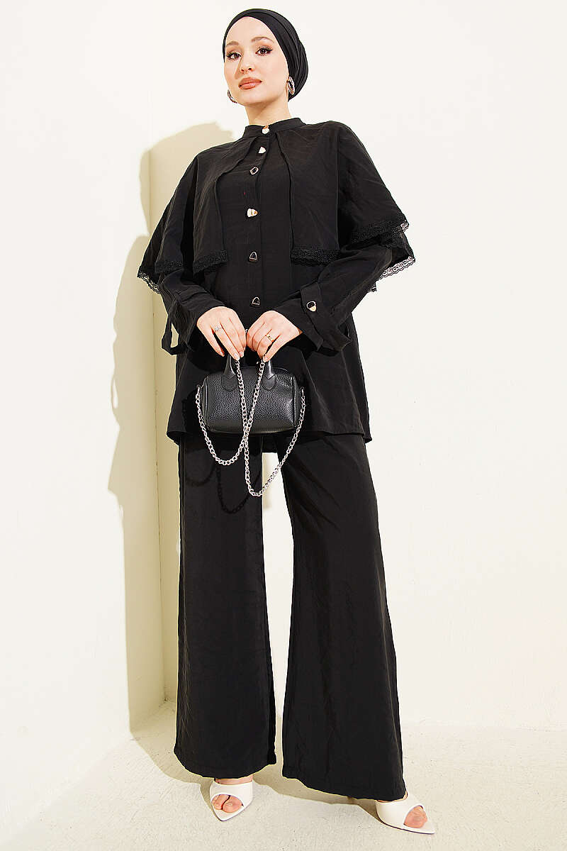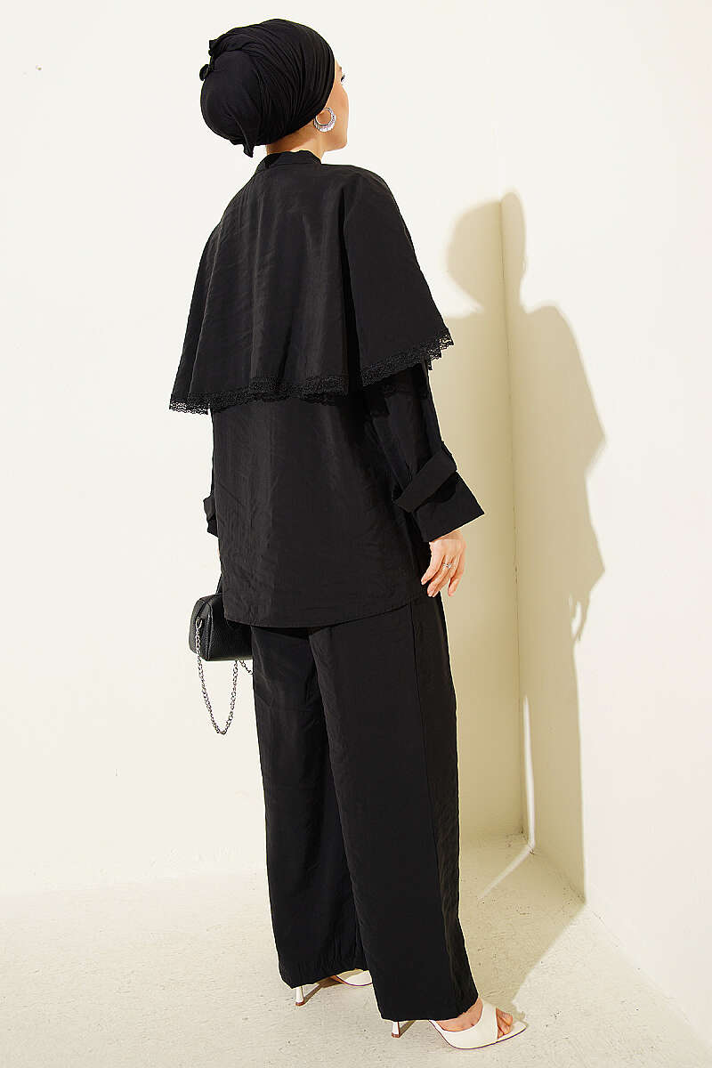 Güprü Detaylı Pelerinli İkili Takım Siyah