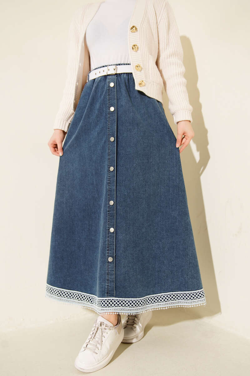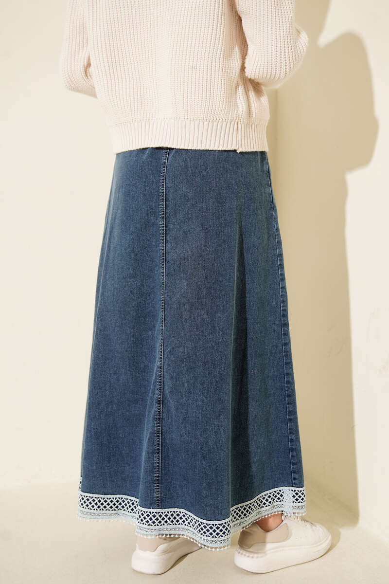 Güpür Detaylı Beli Lastikli Cepli Kot Etek Mavi