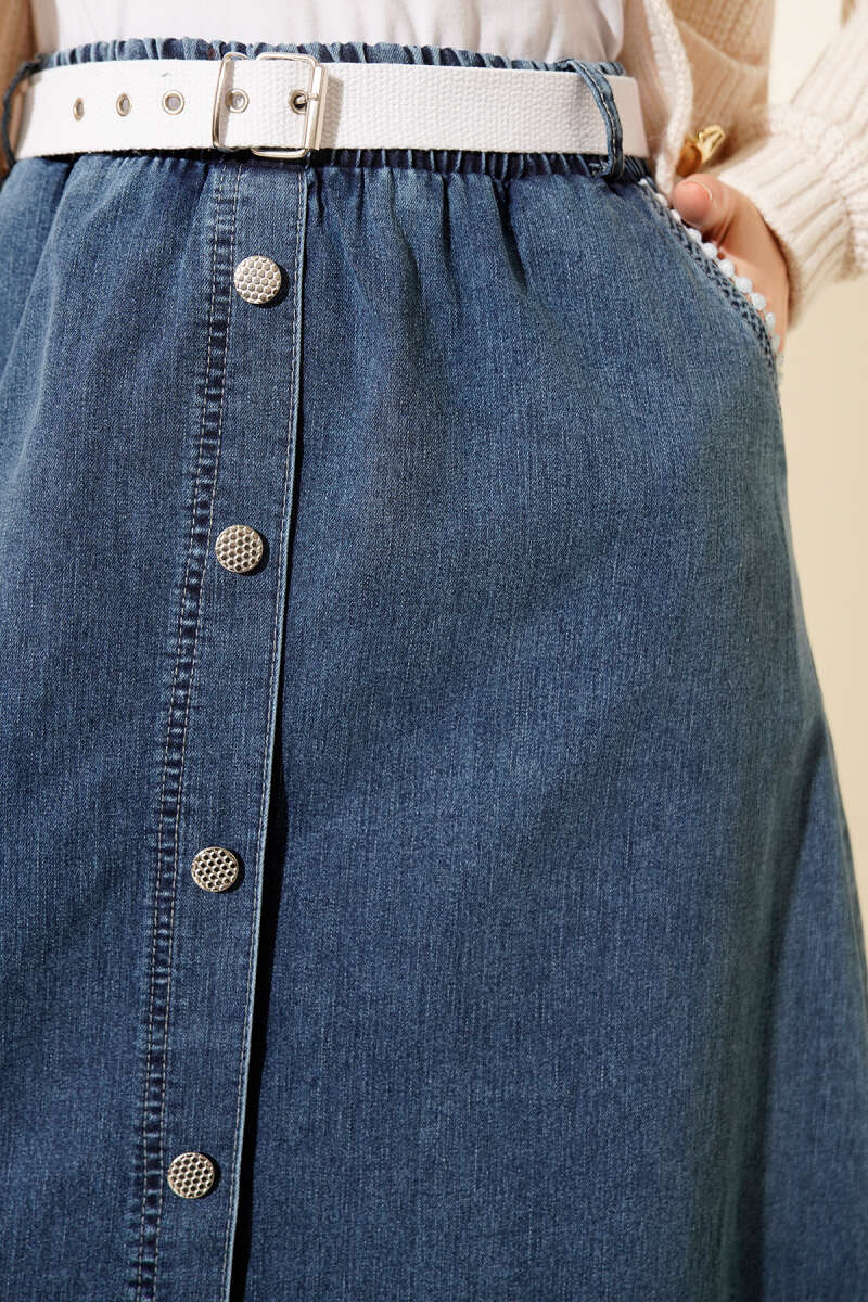 Bel Pile Detaylı Kemerli Kot Etek Mavi