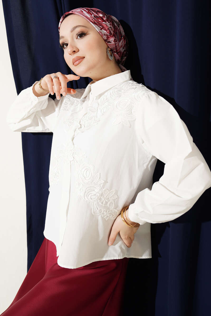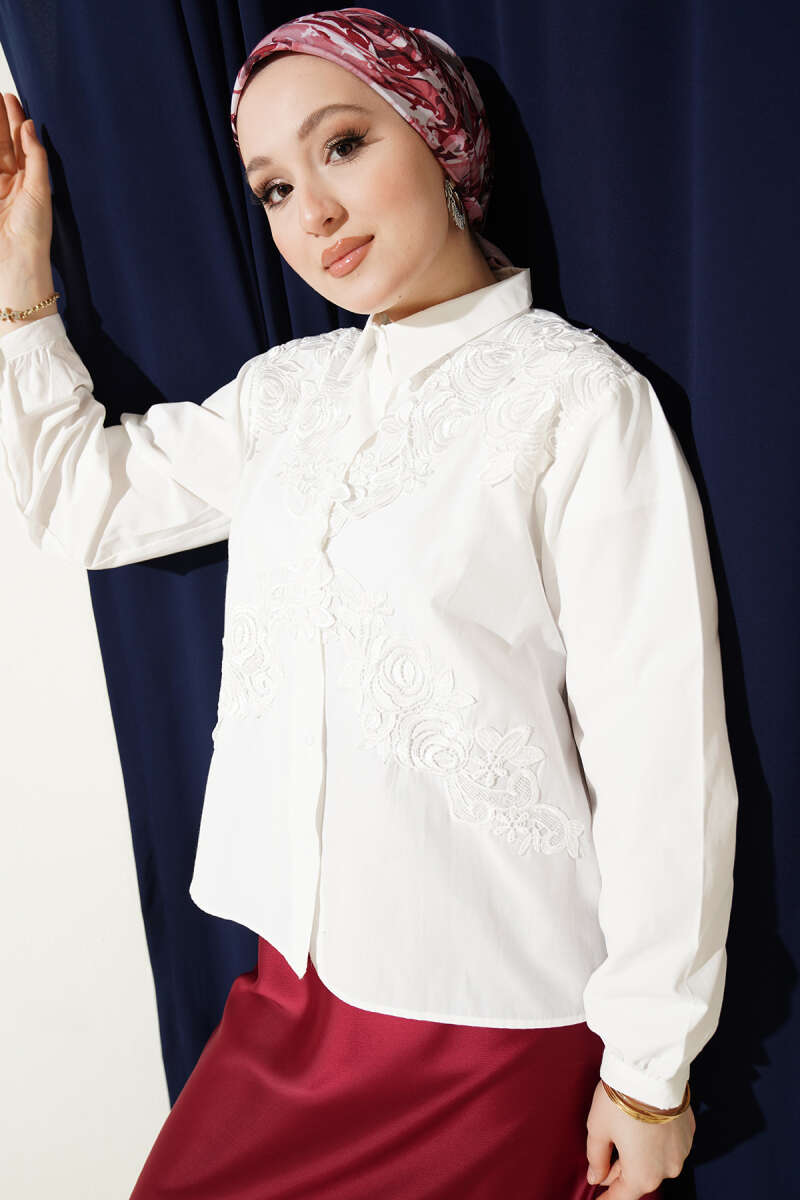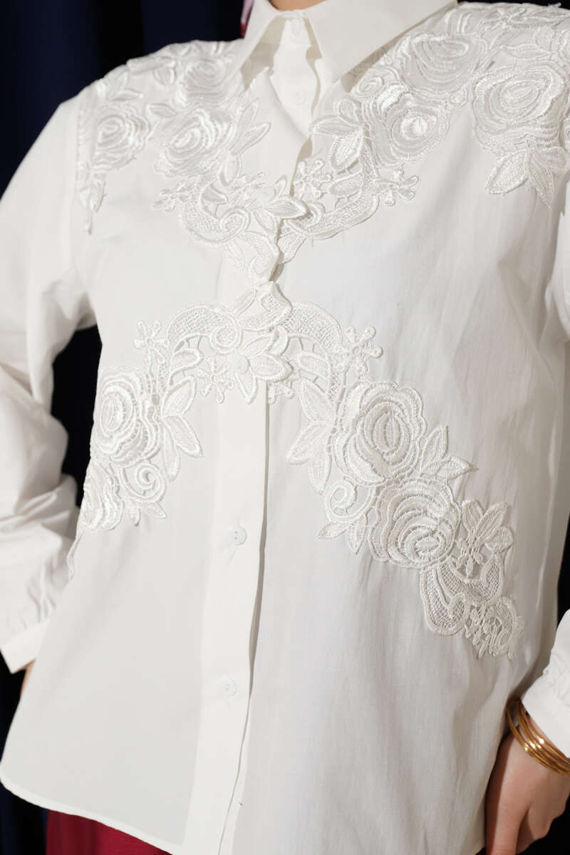 Klasik beyaz gömlek şıklığını, sanatsal güpür ve nakış işleyişiyle bir üst seviyeye taşıyın. Ön kısmındaki asimetrik çiçek desenli güpür detayları, stilinize hem feminen bir hava hem de sofistike bir derinlik katar.