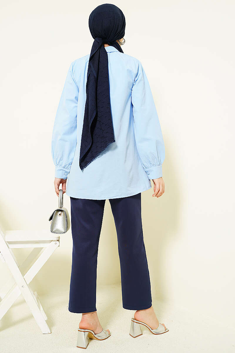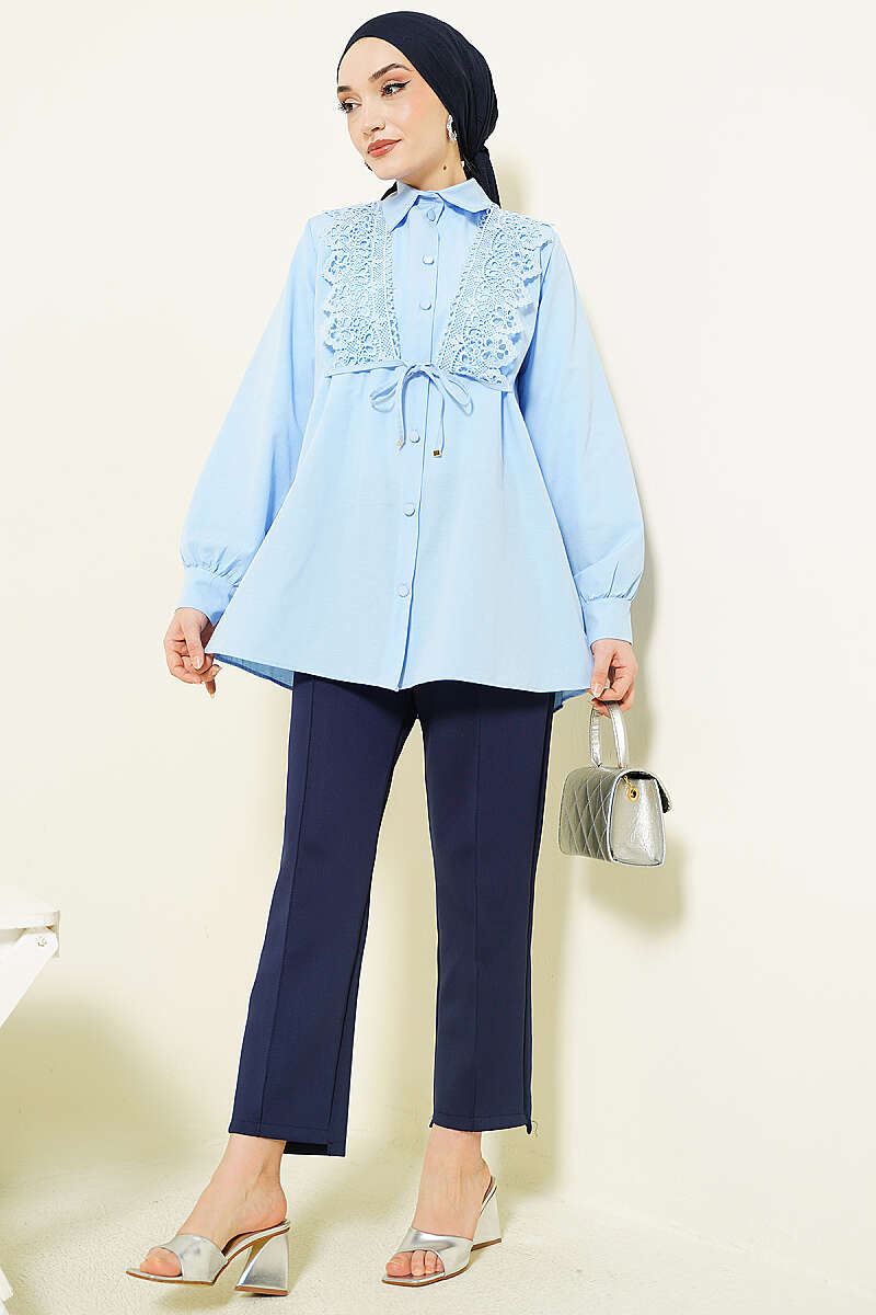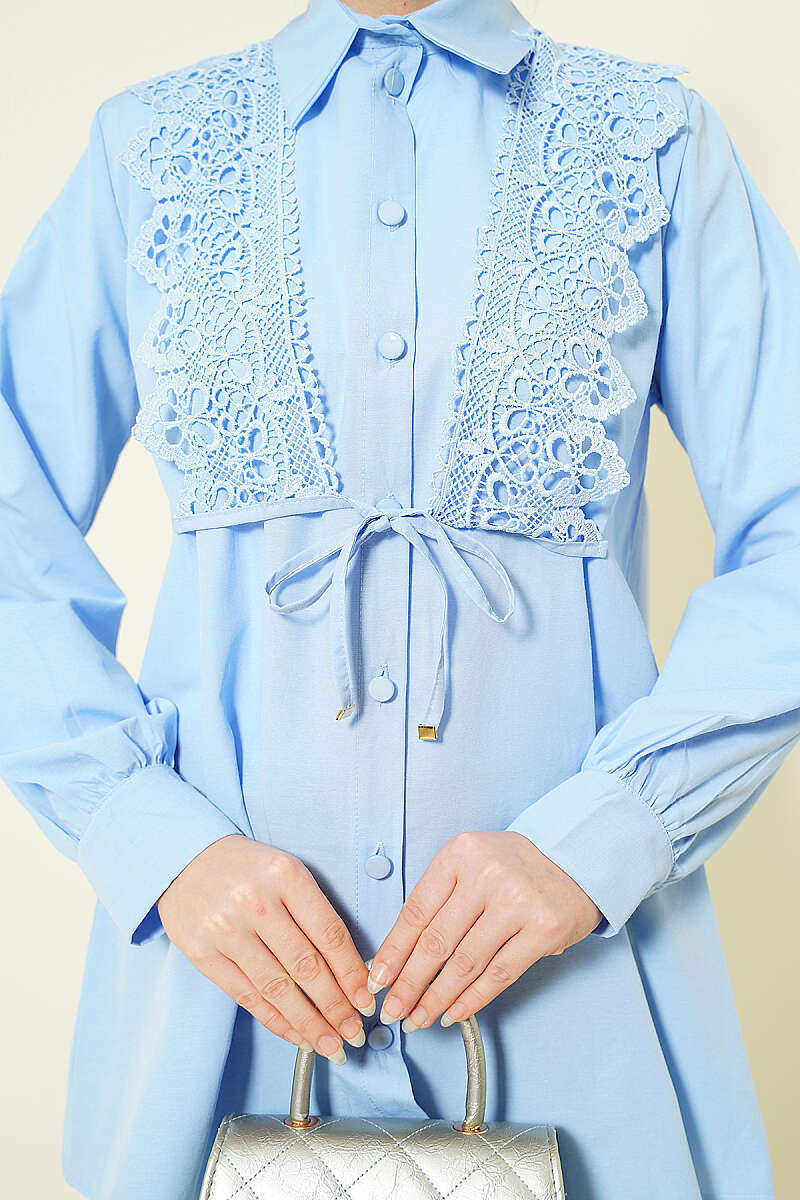 Bu gömlek, ön panelinde yer alan zarif güpür detayları ve göğüs altındaki bağcık detayı ile romantik ve modern bir tasarımı bir araya getiriyor. Belden aşağıya doğru hafifçe genişleyen formu, klasik gömlek yaka ve düğme kapamalarıyla birleşerek şık bir silüet oluşturur. Manşetli uzun kolları ve dökümlü yapısı sayesinde hem günlük kombinlerde hem de daha özel anlarda rahatlıkla tercih edilebilecek, detaylarıyla fark yaratan bir parçadır.