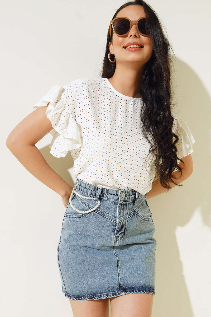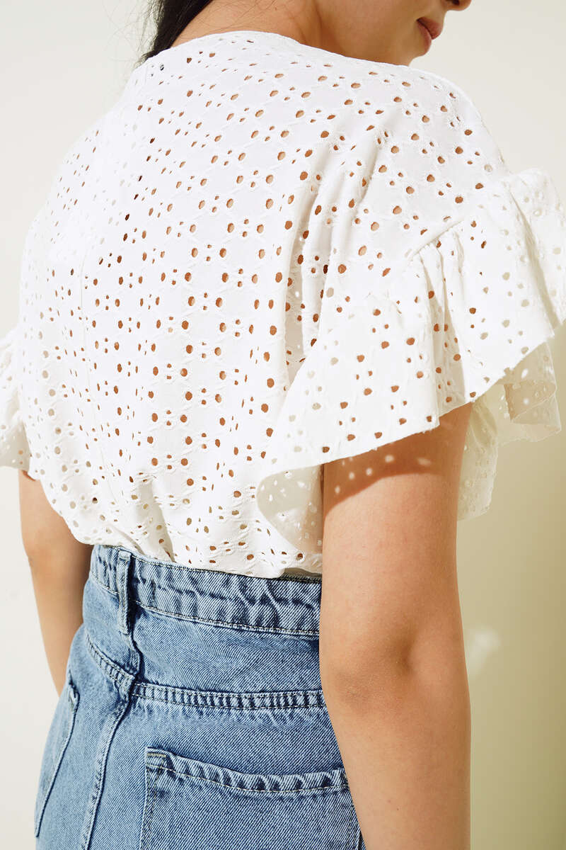 Yeni sezon bluzumuz oval yaka modeldir. Bluzumuz güpürlü yapısıyla dikkat çekmektedir. Balon kol detaylı olan bluzumuzun omuzları fırfırlıdır.
