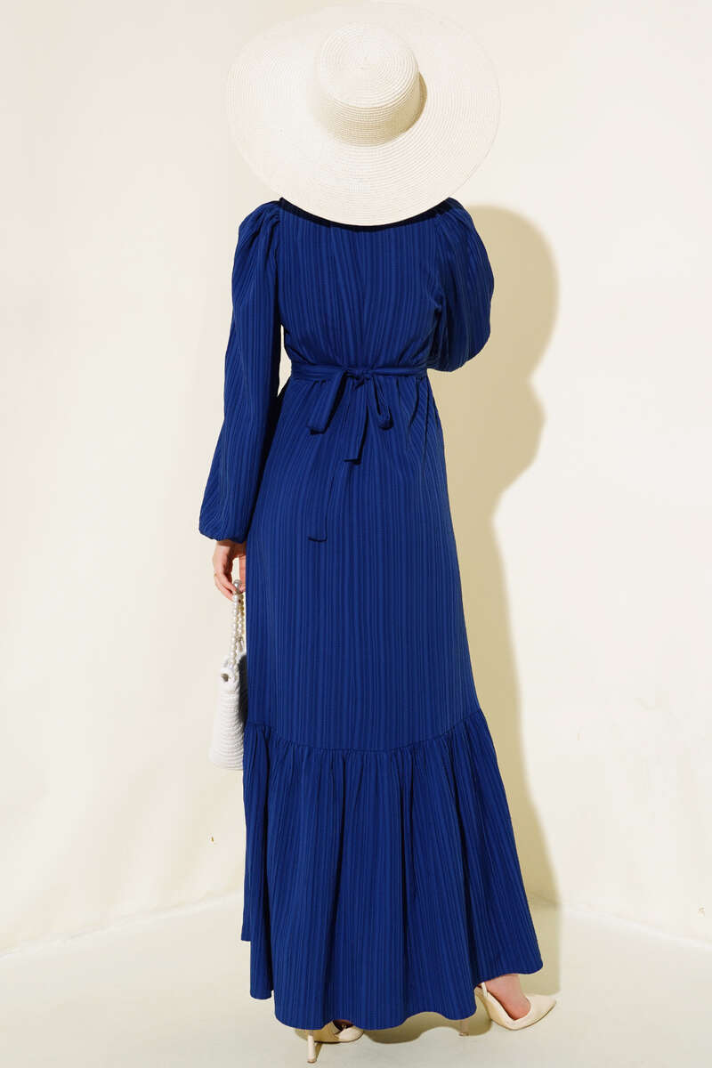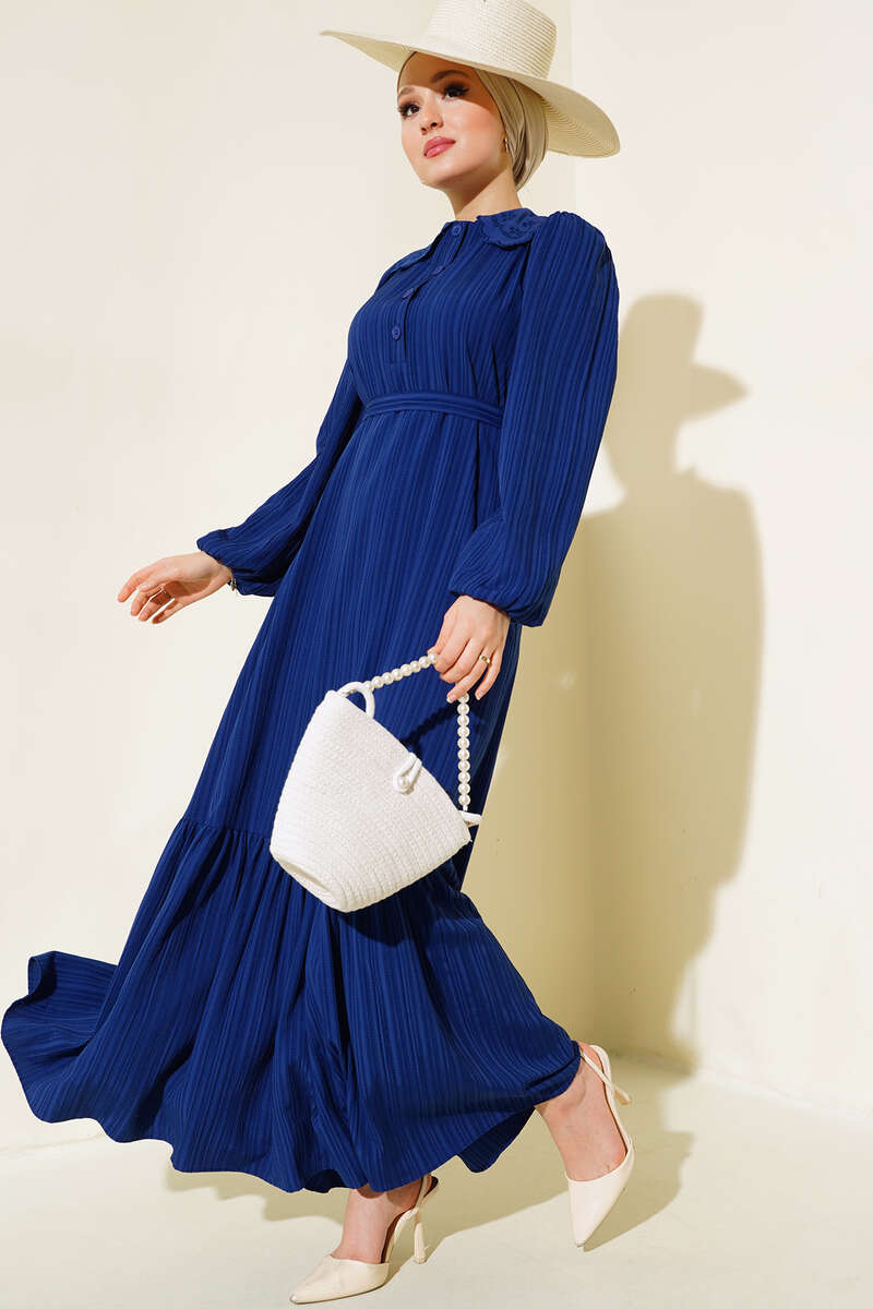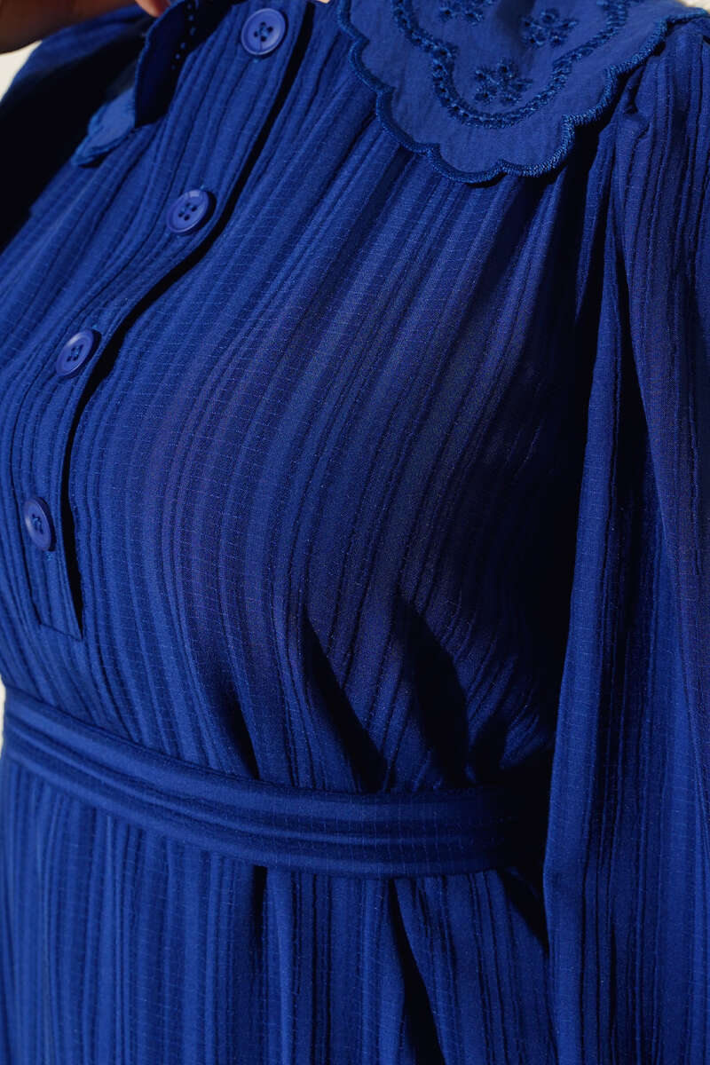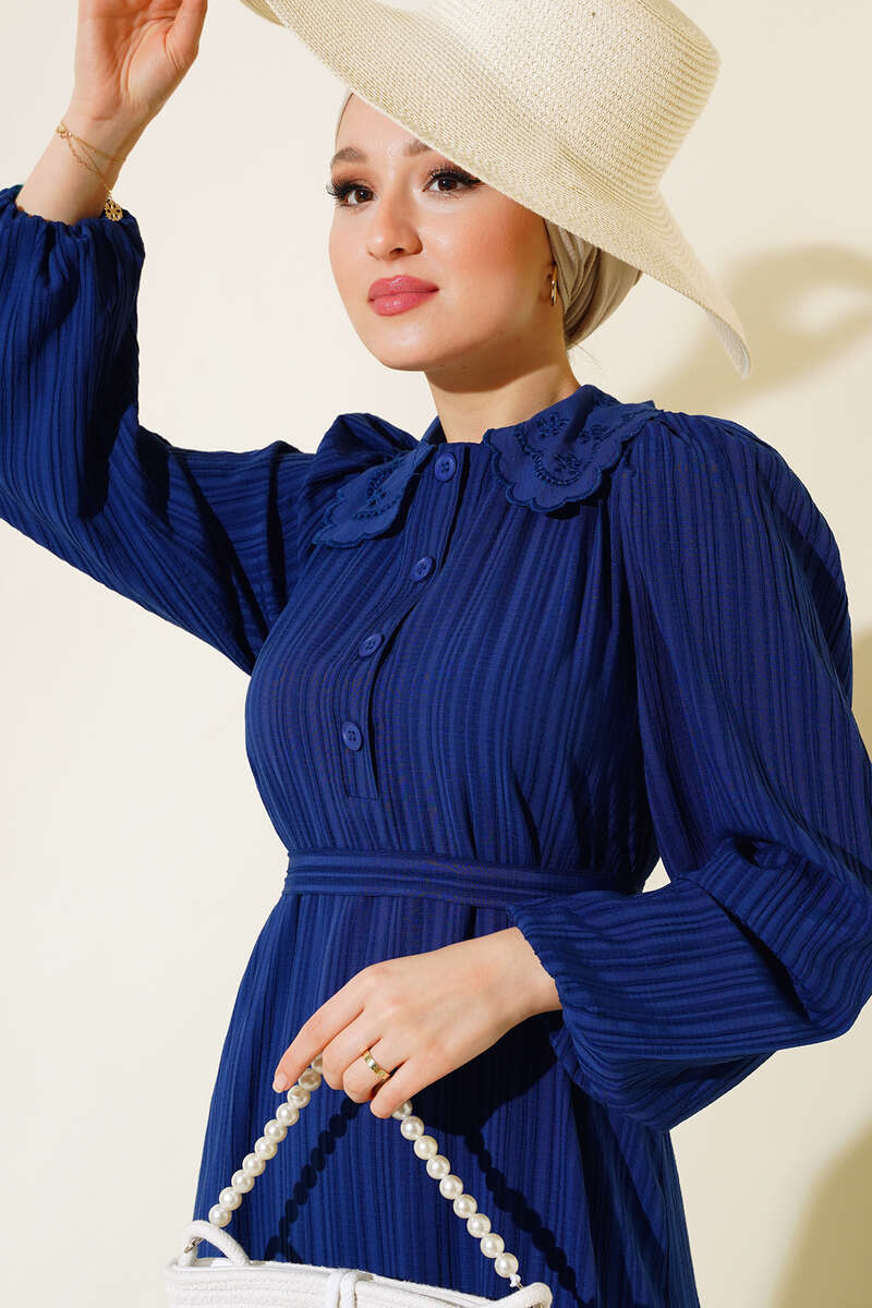 Yeni sezon elbisemiz yumuşak dokusuyla ve rahat tarzıyla sezonun favorileri arasındadır. Bebe yakası güpürlü olan elbisemizin şık duruşuna etki eden yaka düğmeleri elbisemizle aynı renktir. Bilekleri lastikli elbisemizin beli kuşaklıdır.