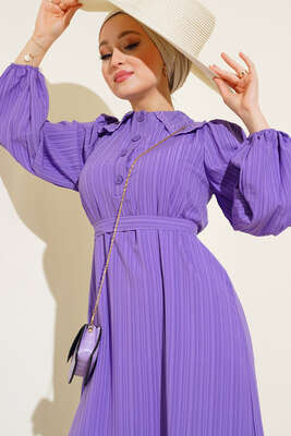 Yeni sezon elbisemiz yumuşak dokusuyla ve rahat tarzıyla sezonun favorileri arasındadır. Bebe yakası güpürlü olan elbisemizin şık duruşuna etki eden yaka düğmeleri elbisemizle aynı renktir. Bilekleri lastikli elbisemizin beli kuşaklıdır.