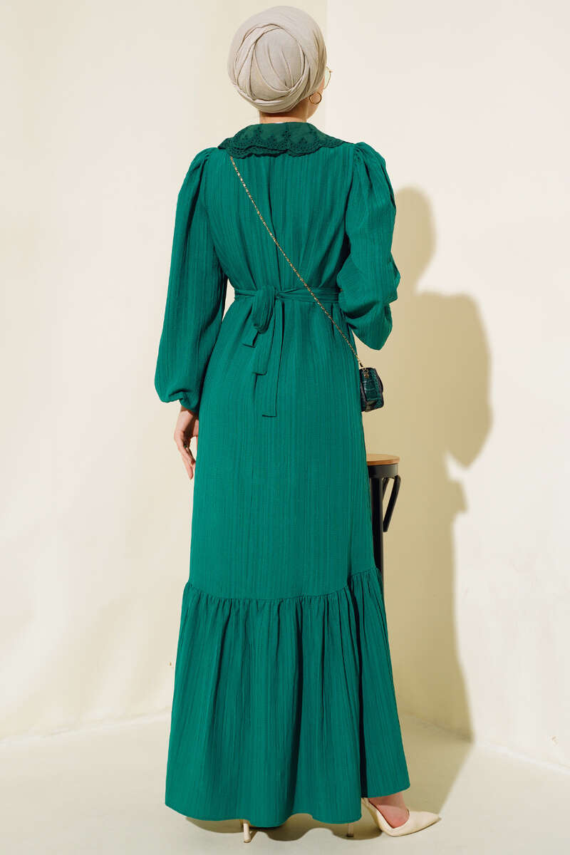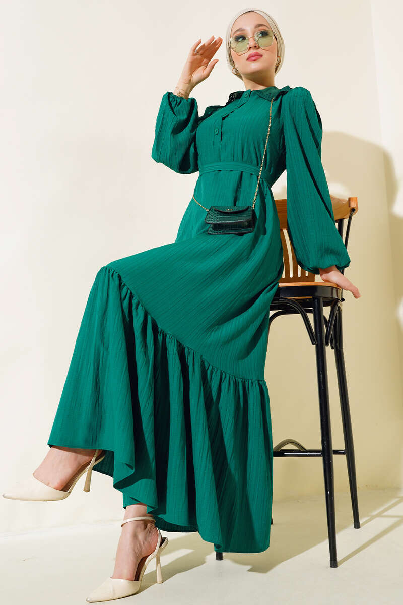 Yeni sezon elbisemiz yumuşak dokusuyla ve rahat tarzıyla sezonun favorileri arasındadır. Bebe yakası güpürlü olan elbisemizin şık duruşuna etki eden yaka düğmeleri elbisemizle aynı renktir. Bilekleri lastikli elbisemizin beli kuşaklıdır.