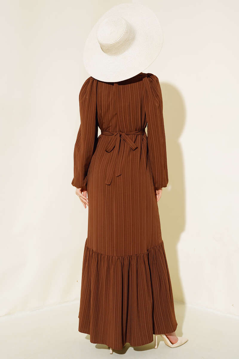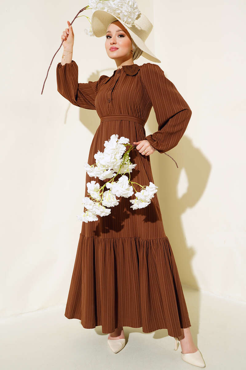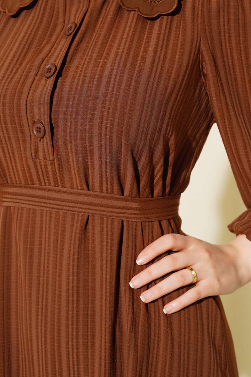 Yeni sezon elbisemiz yumuşak dokusuyla ve rahat tarzıyla sezonun favorileri arasındadır. Bebe yakası güpürlü olan elbisemizin şık duruşuna etki eden yaka düğmeleri elbisemizle aynı renktir. Bilekleri lastikli elbisemizin beli kuşaklıdır.