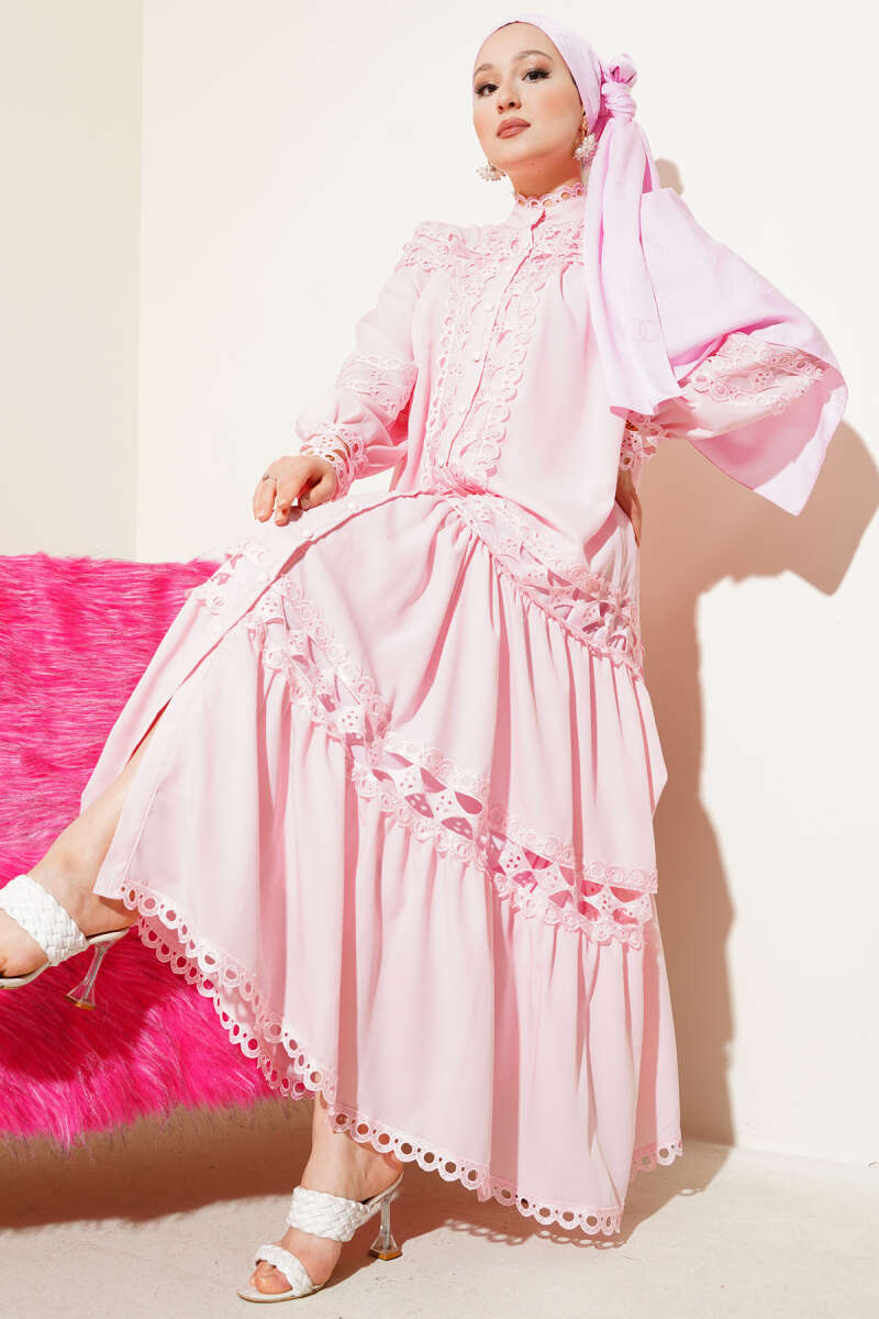 Baklava Desen Ajurlu Triko Elbise Gül Kurusu