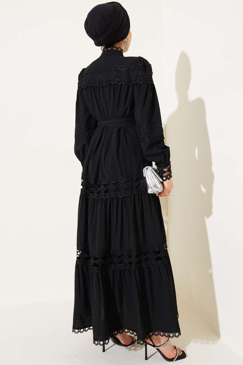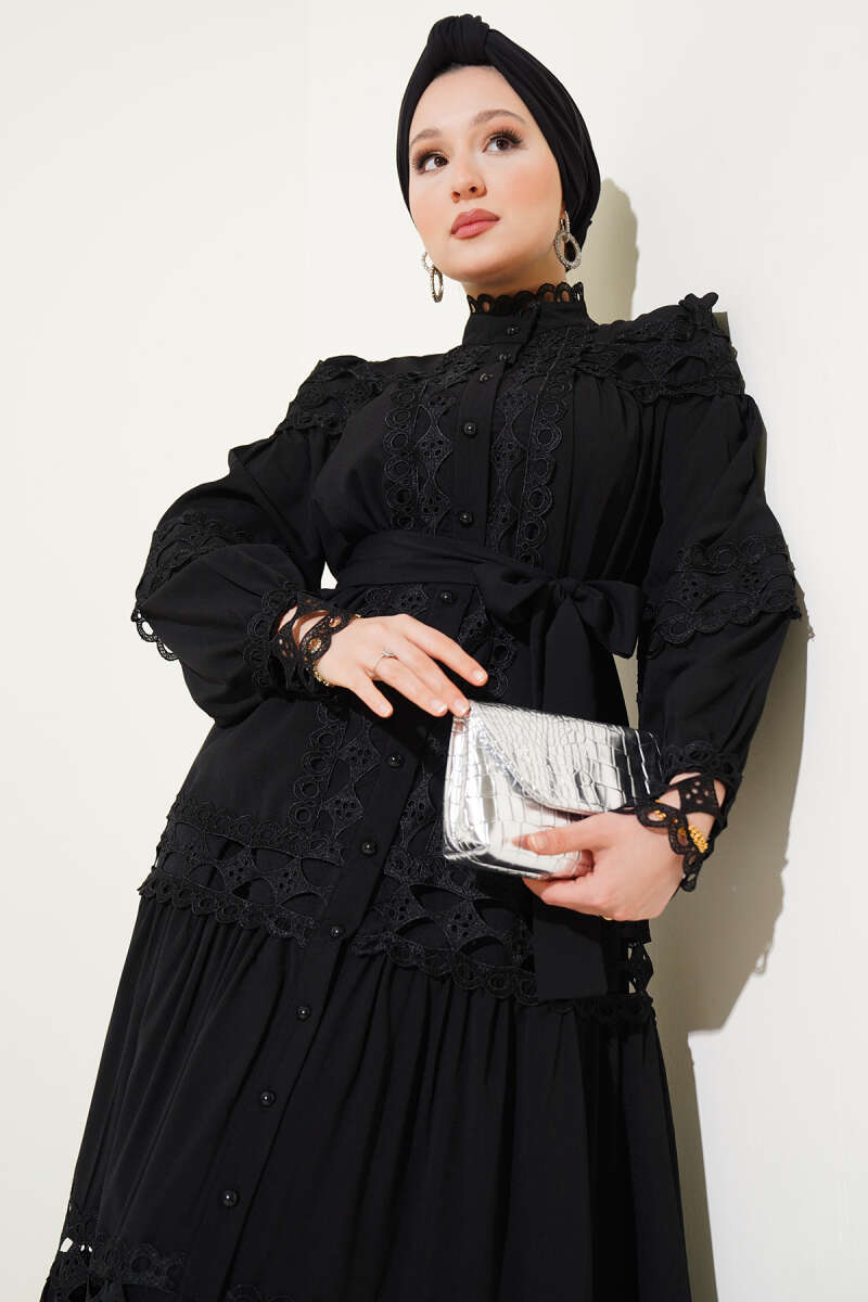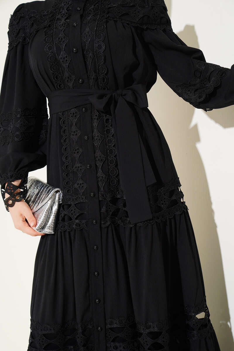 Güpürlü Boydan Düğmeli Elbise Siyah
