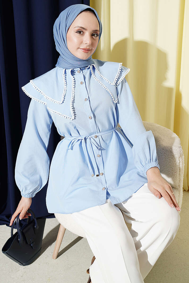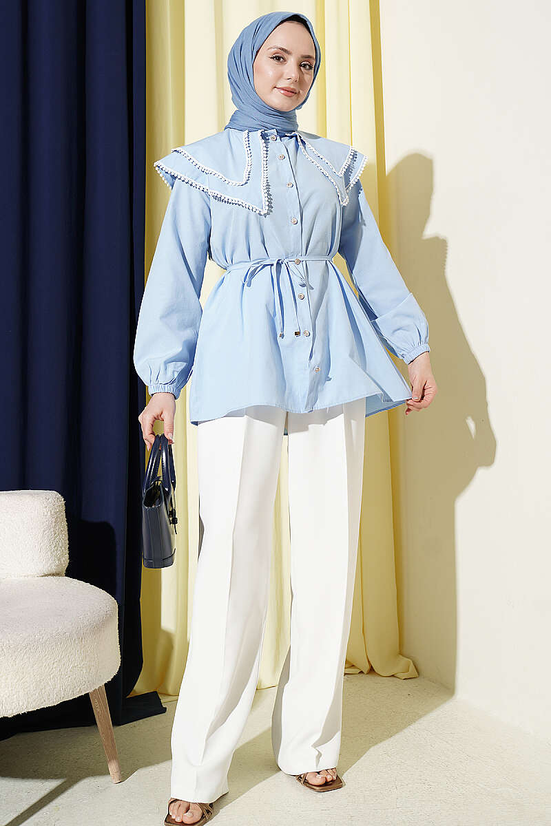 Üst üste binen çift denizci yakası ve yakadaki zarif güpür detaylarıyla vintage bir hava sunan bu gömlek, romantik ve modern stili bir araya getiriyor. Balon kol tasarımı ve geniş manşetleri, tasarıma sofistike bir hacim kazandırırken çabasız bir zarafet sergiliyor. Kaliteli dokusu ve dikkat çekici yaka formu sayesinde hem günlük kombinlerde hem de daha özel buluşmalarda tarzınızı bir adım öne çıkarıyor. Minimal düğme detayları ve dökümlü kesimiyle gardırobunuzun en şık ve özgün parçalarından biri olmaya adaydır.