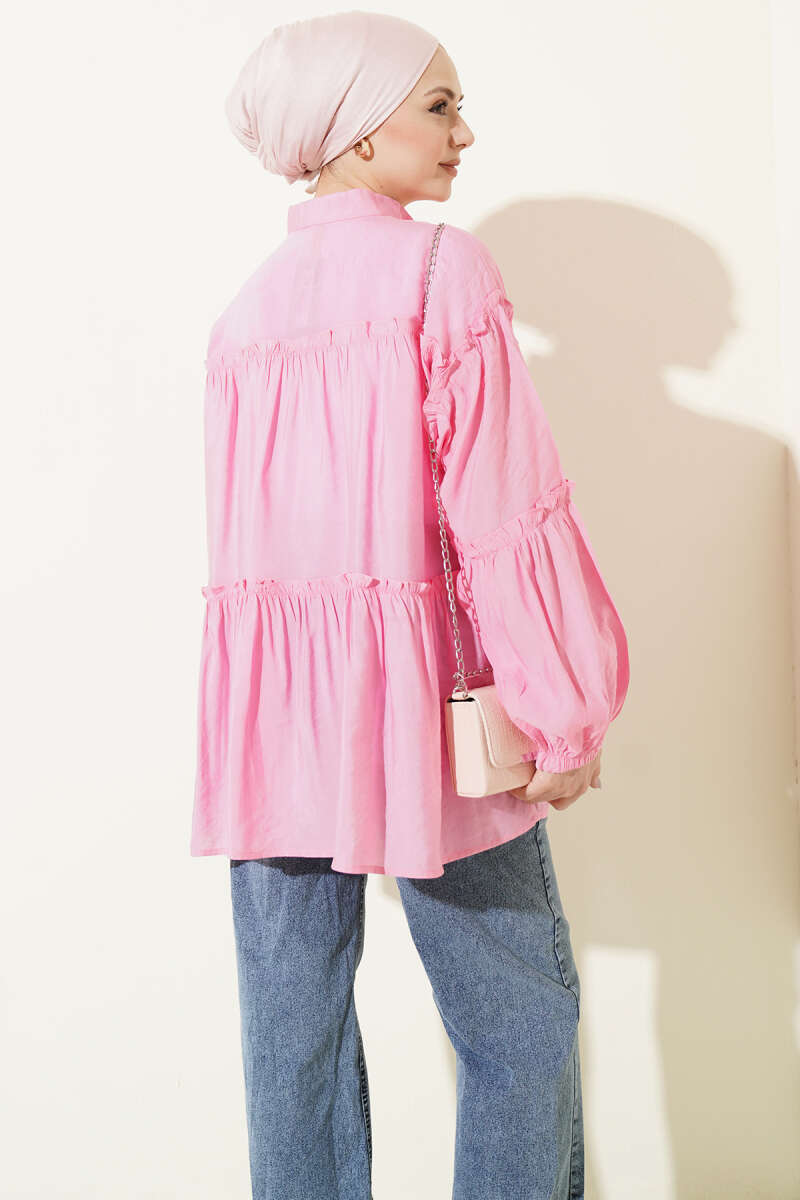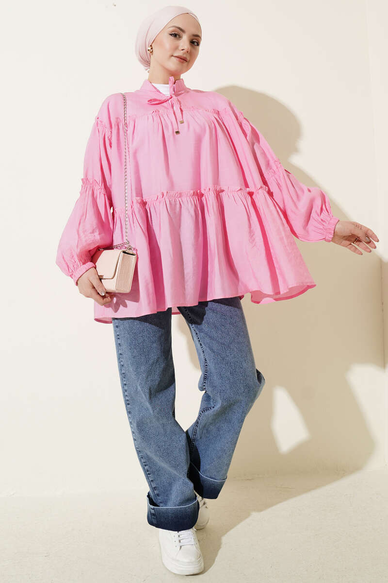 Minimalist tasarımı ve modern kesimiyle öne çıkan bu tunik, çabasız şıklığın en konforlu halini sunuyor. Hakim yaka detayı ve boydan düğmeli yapısı klasik bir silüet oluştururken, düşük omuz kesimi tasarıma çağdaş bir dokunuş katıyor.