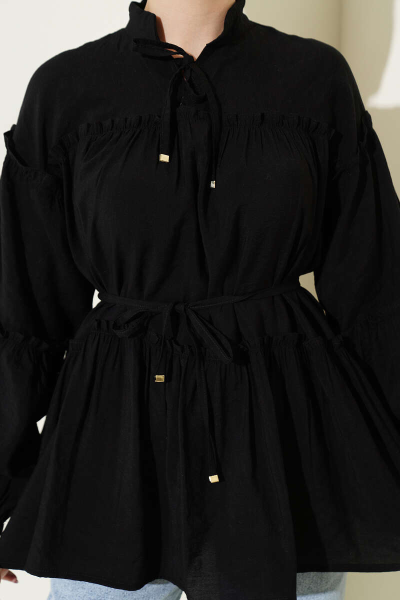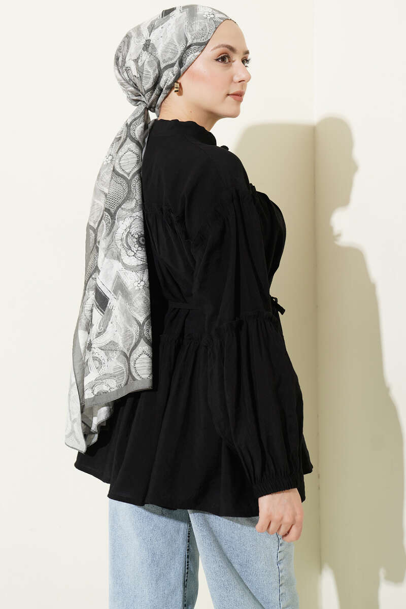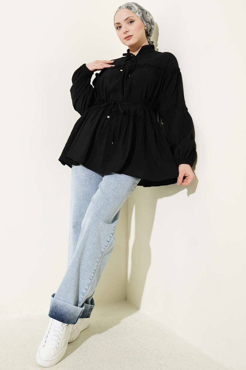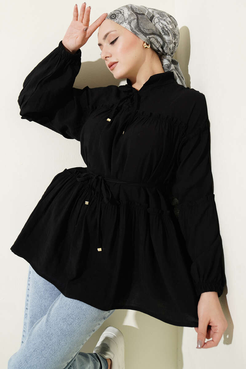 Minimalist tasarımı ve modern kesimiyle öne çıkan bu tunik, çabasız şıklığın en konforlu halini sunuyor. Hakim yaka detayı ve boydan düğmeli yapısı klasik bir silüet oluştururken, düşük omuz kesimi tasarıma çağdaş bir dokunuş katıyor.