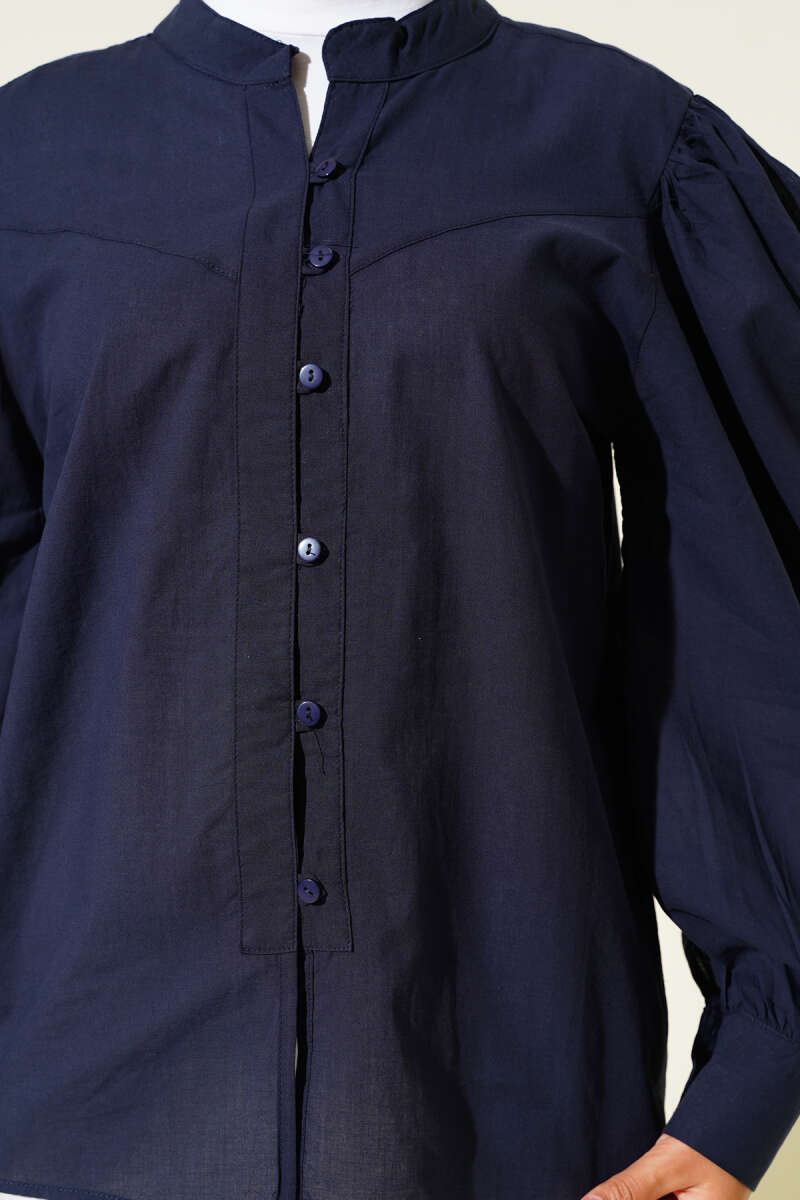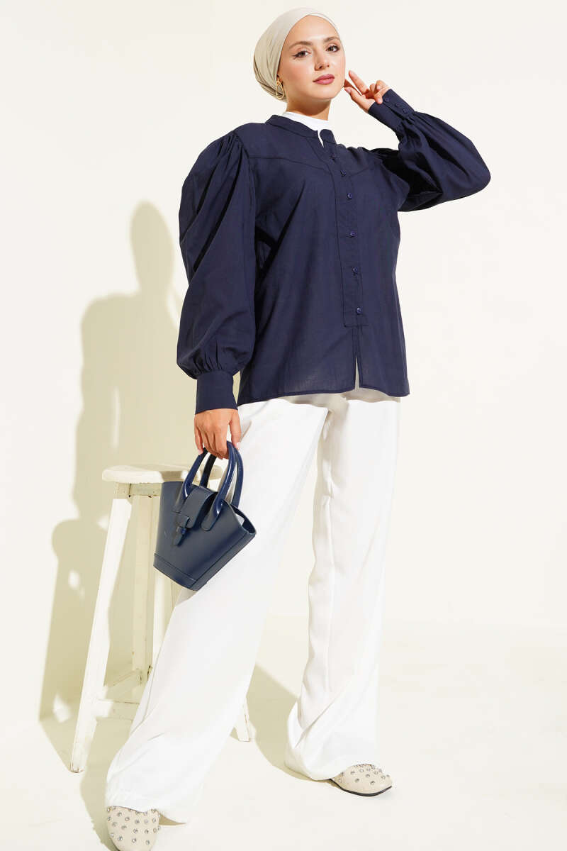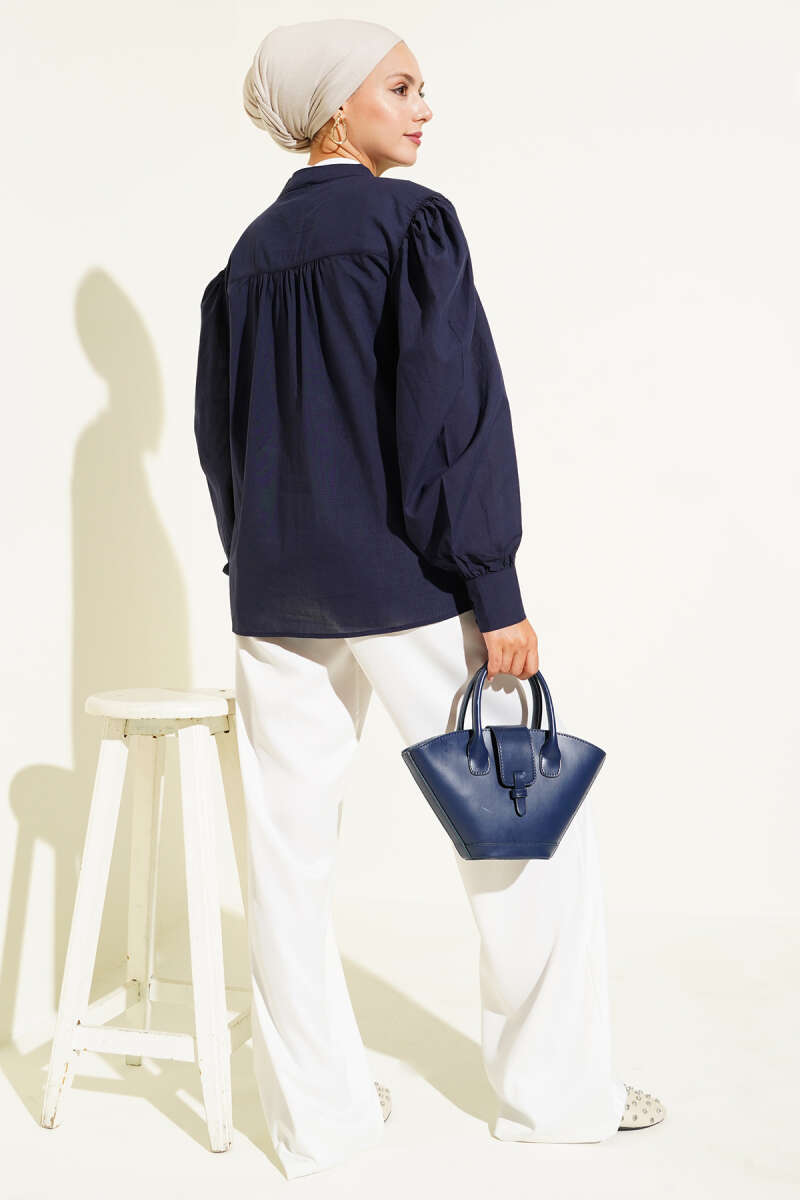 Brit Düğmeli Pileli Tensel Gömlek Lacivert