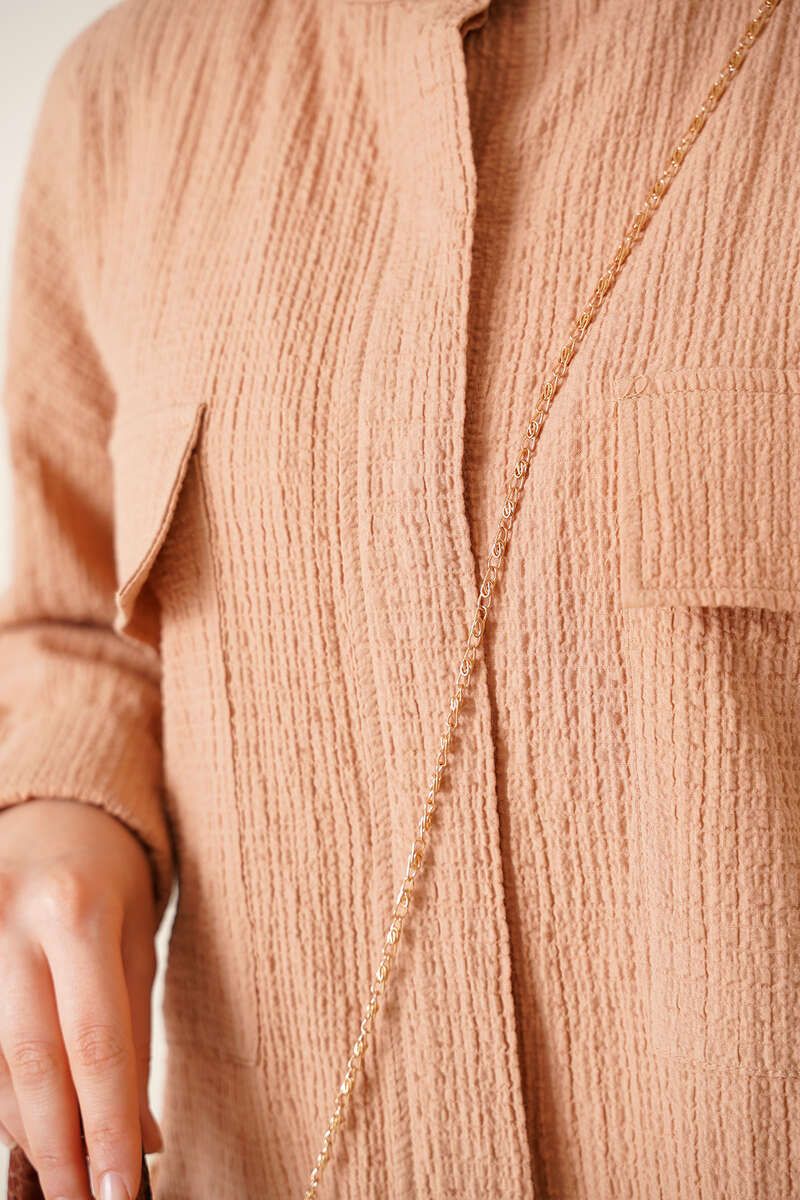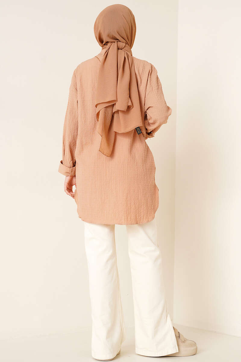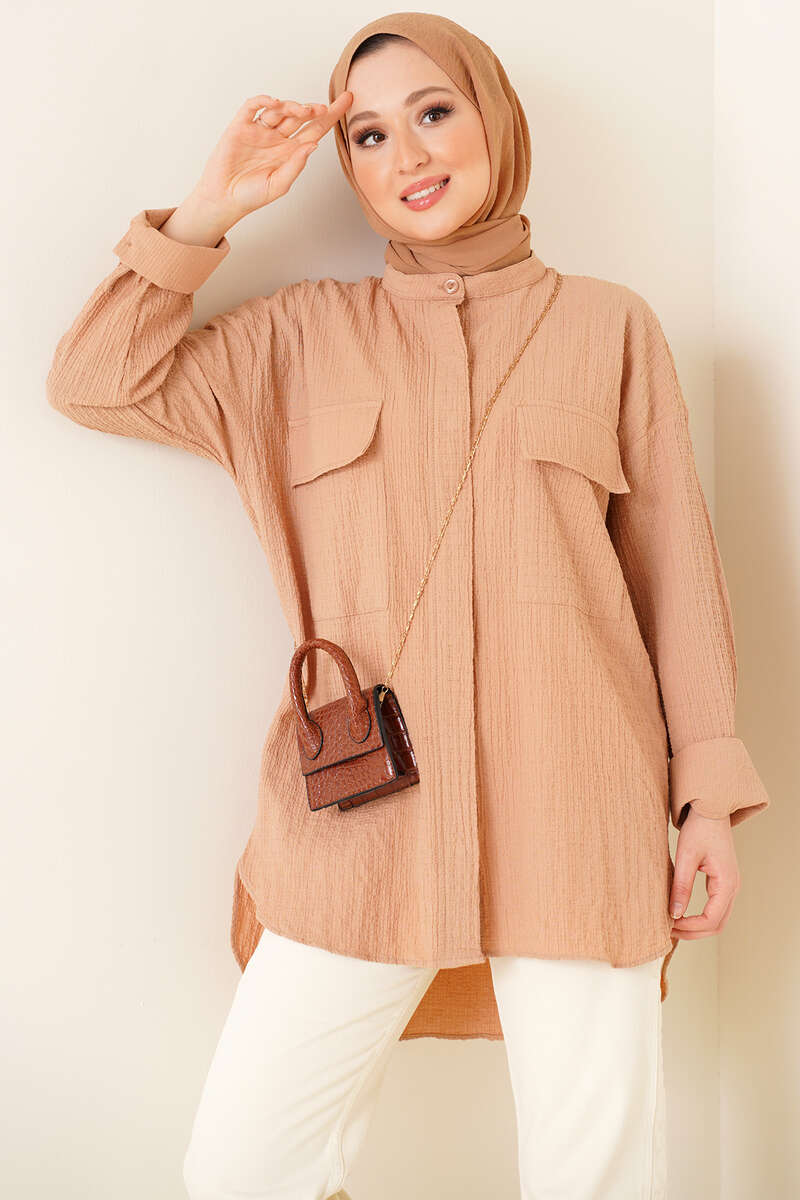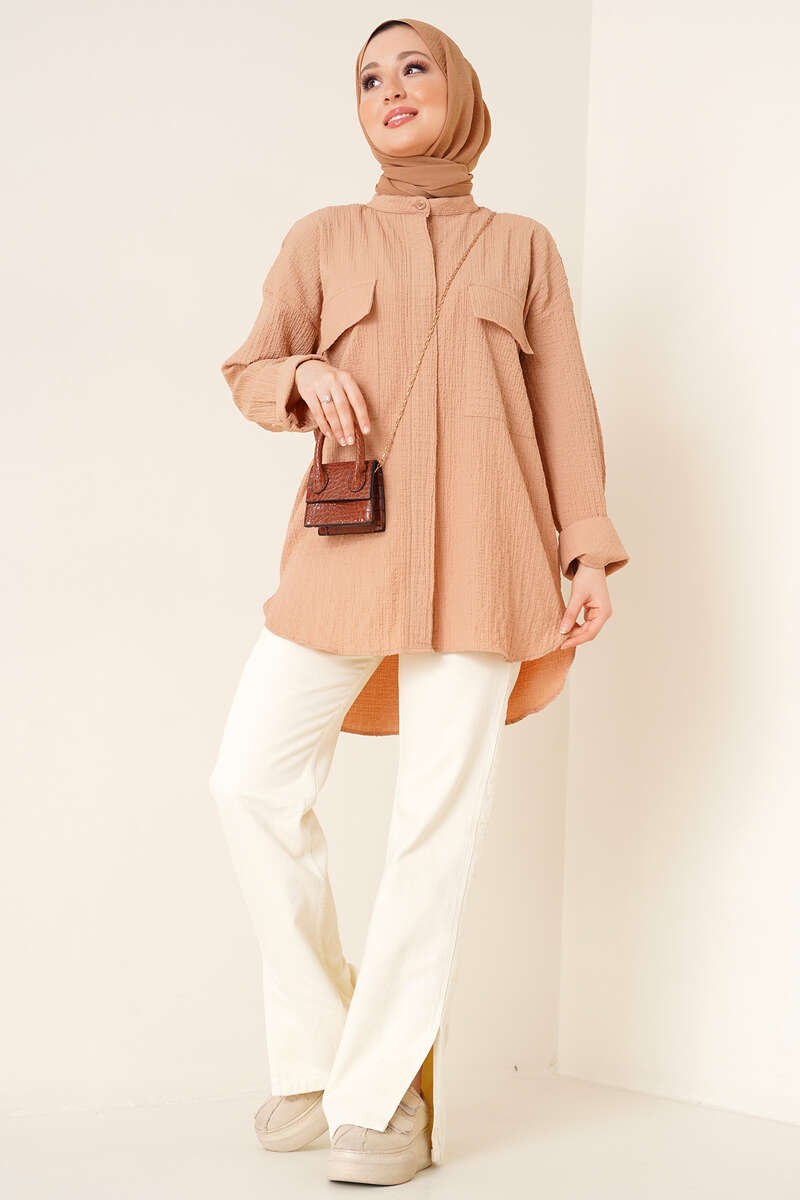Yeni sezon gömleğimiz göğsünde bulunan iki adet kapaklı cebiyle şıklığına sportif bir görünüm katmıştır. Cepleri kullanılabilmektedir. Arkası önnden uzun olan gömleğimiz düşük omuz modeldir. Hakim yakadır. Manşetli bilekleri iki düğmelidr.