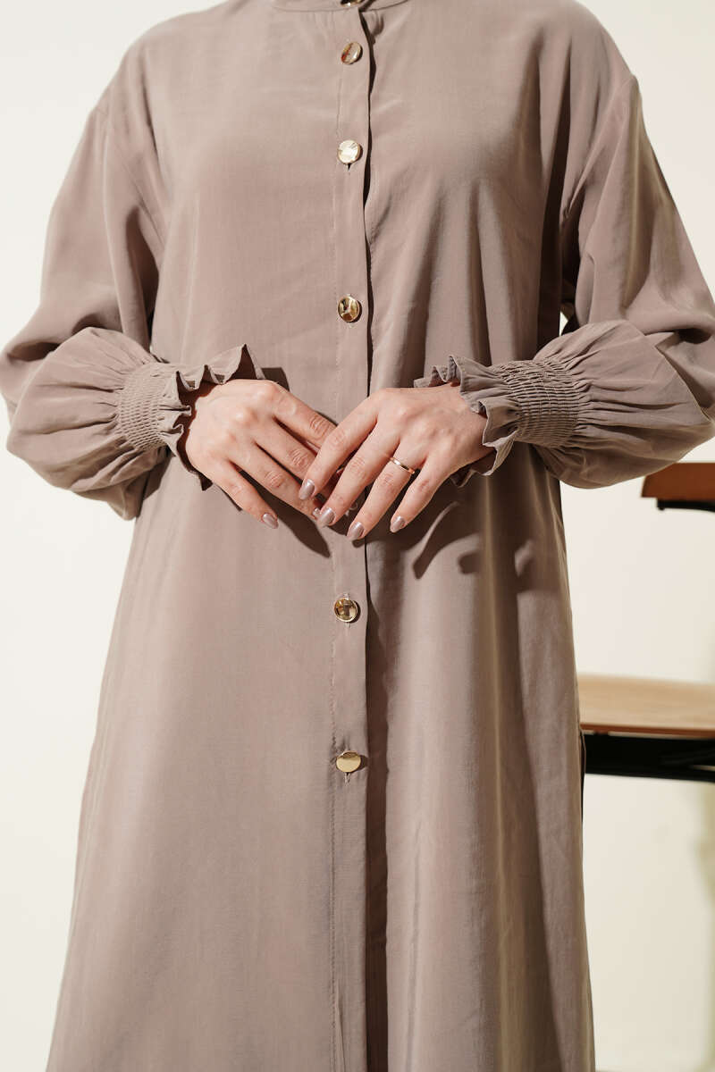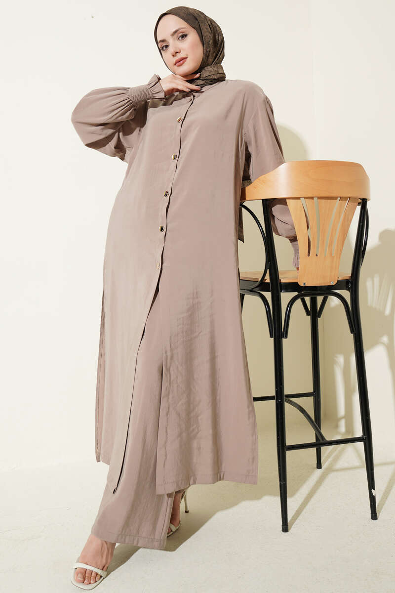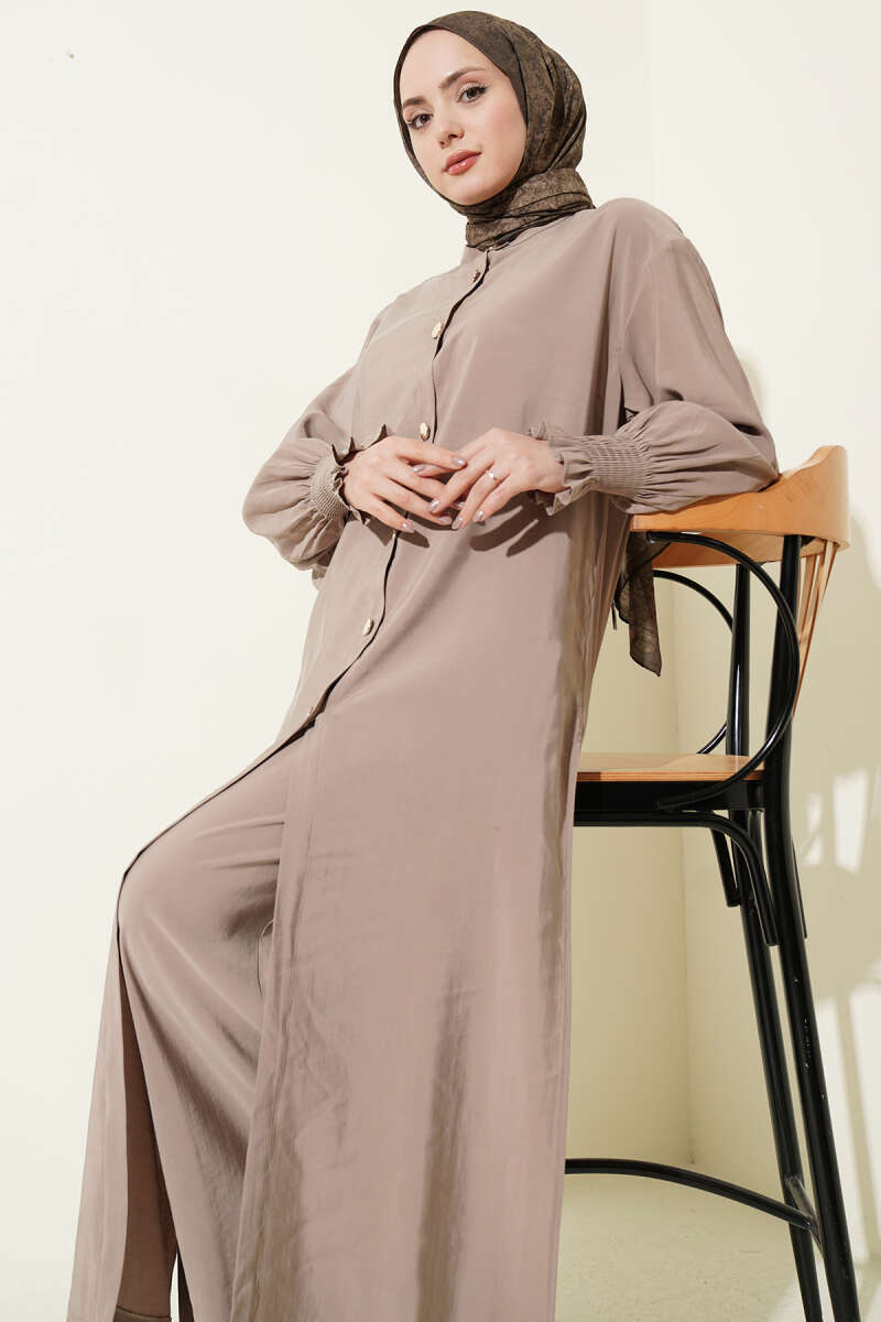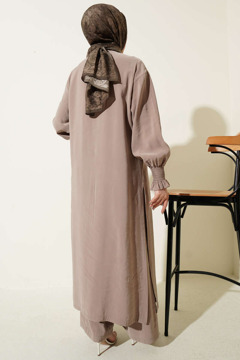 Yaka Büzgülü Fiyonklu Etekli İkili Takım Latte