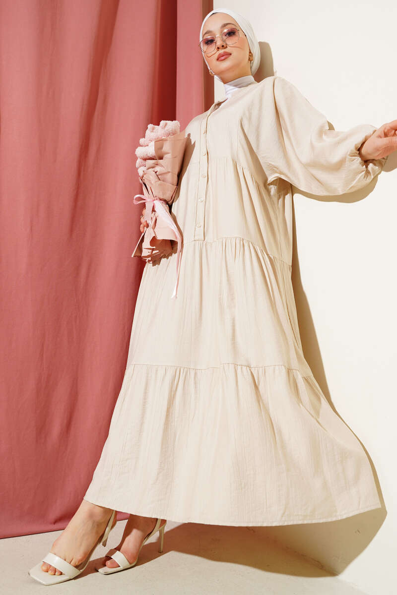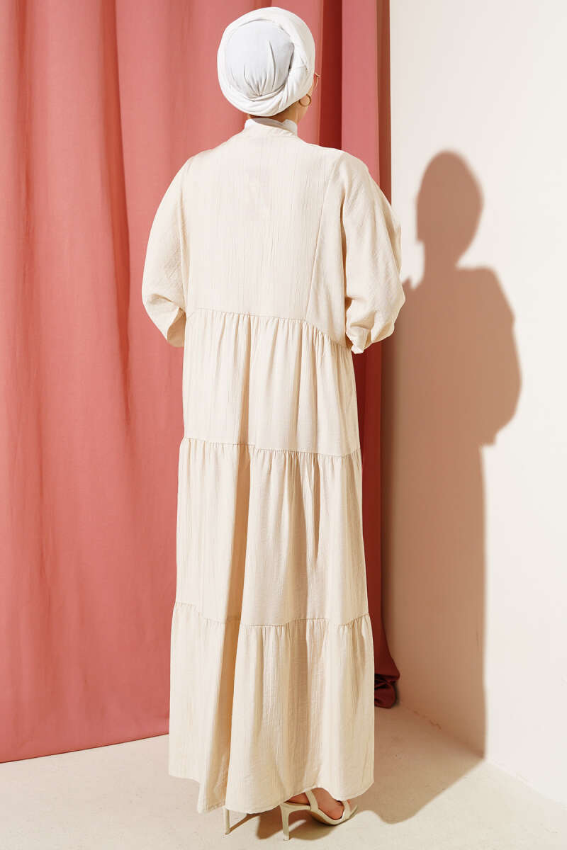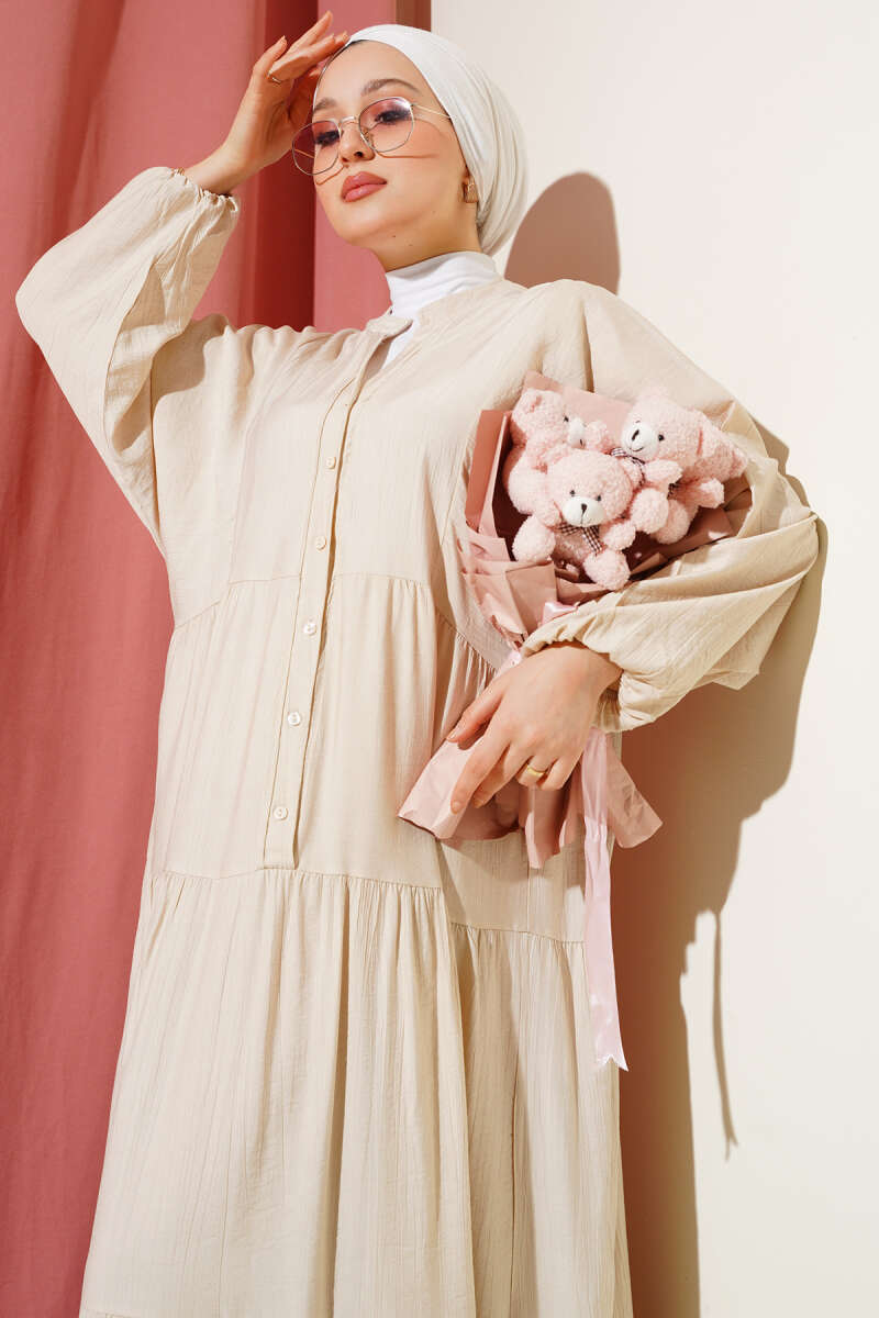 Çizgi Gömlek Garnili Triko Elbise Bej