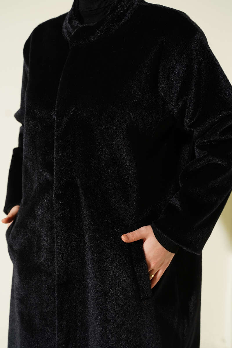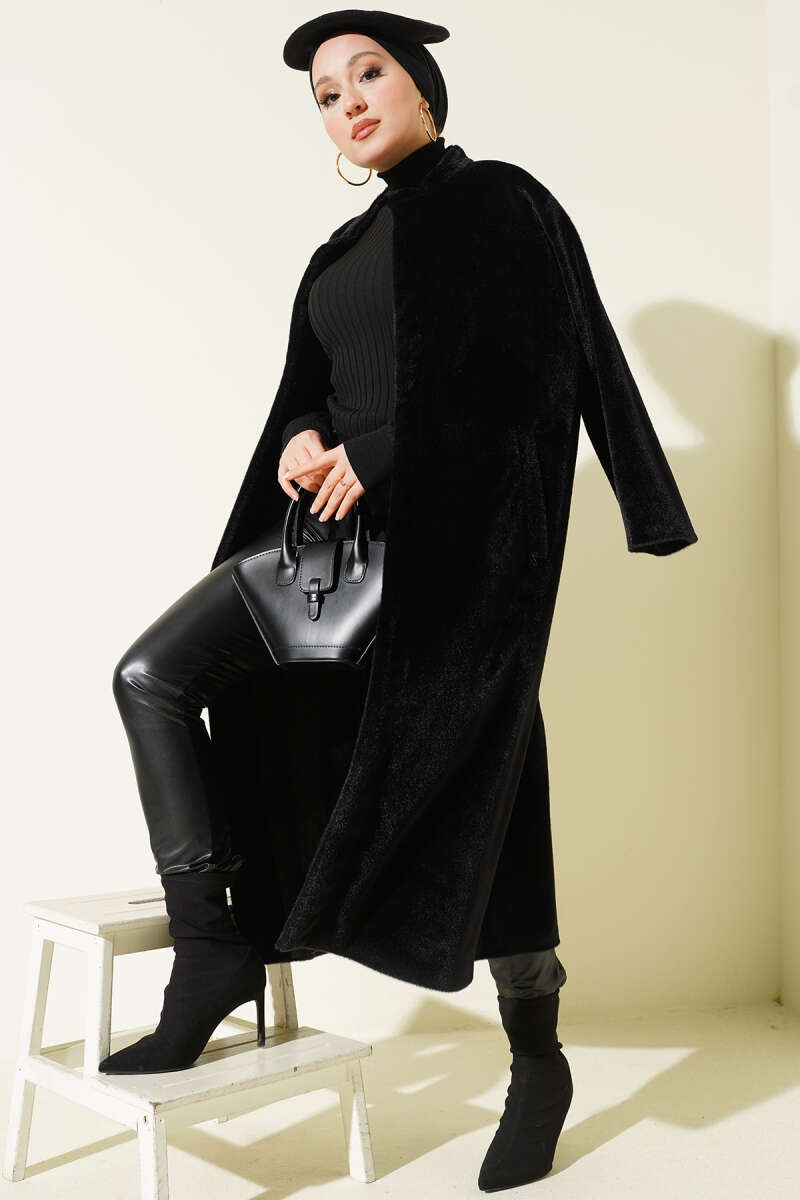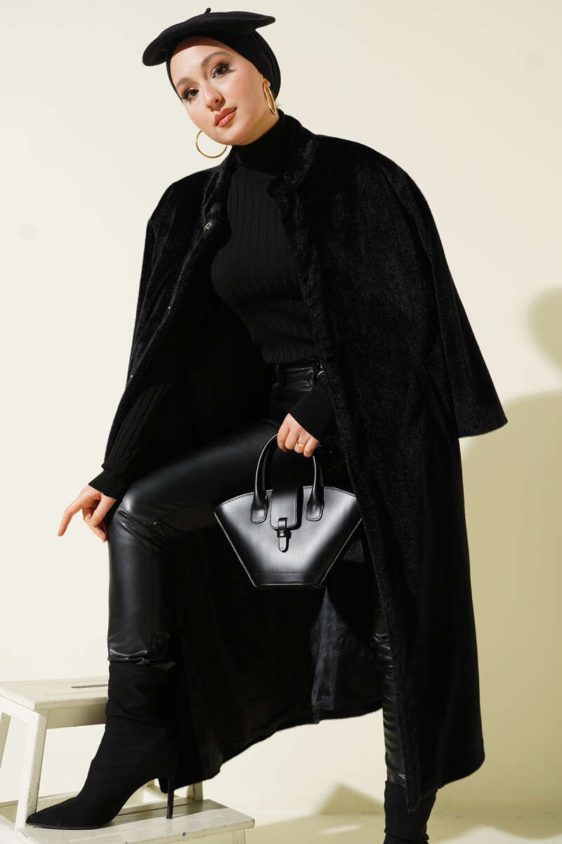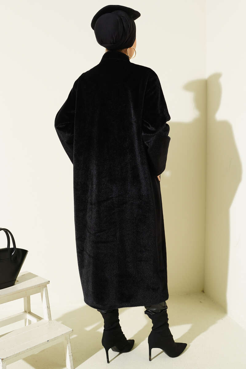Yaka ve Bilek Kürklü Kaşe Kaban Siyah