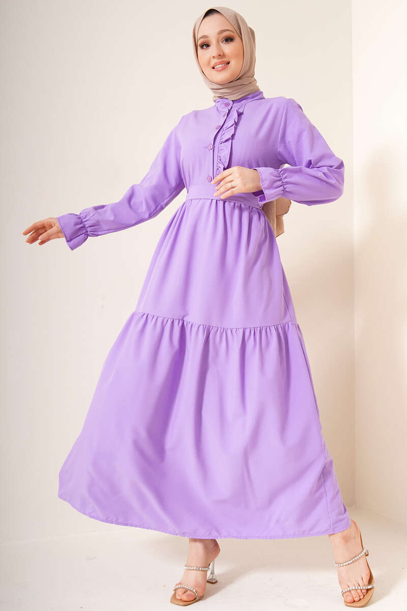 Yeni sezon elbisemiz hakim yakadır. Göğsünde bulunan düğmelerine fırfır detayları eşlik etmektedir. Beli kuaşklı olan elbisemizin iki adet kemer köprüsü bulunmaktadır. Kat kat model olan elbisemizin bilekleri lastiklidir.
