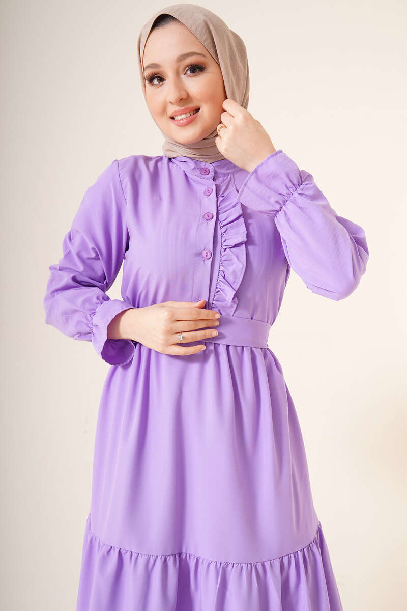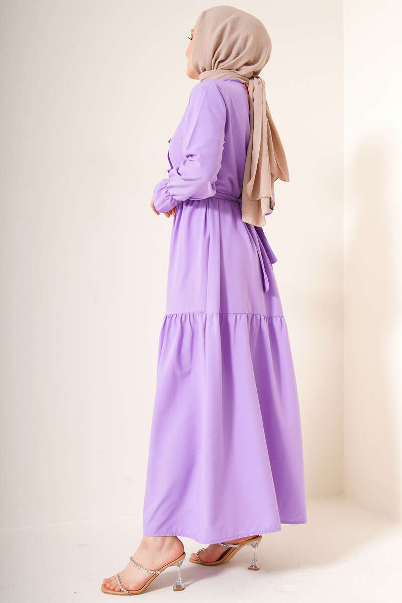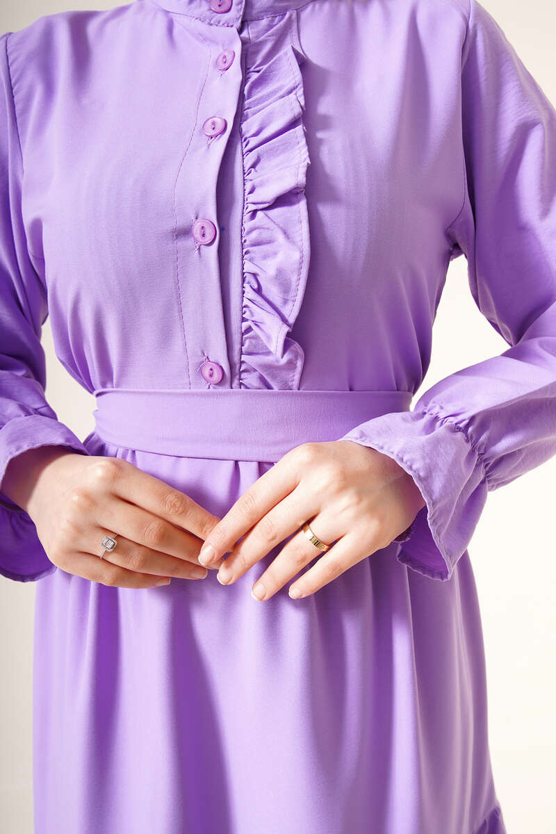 Hakim Yaka Kuşaklı Elbise Lila