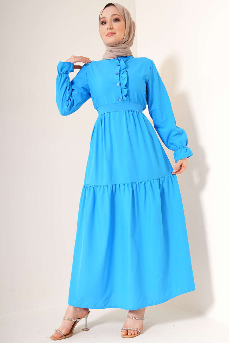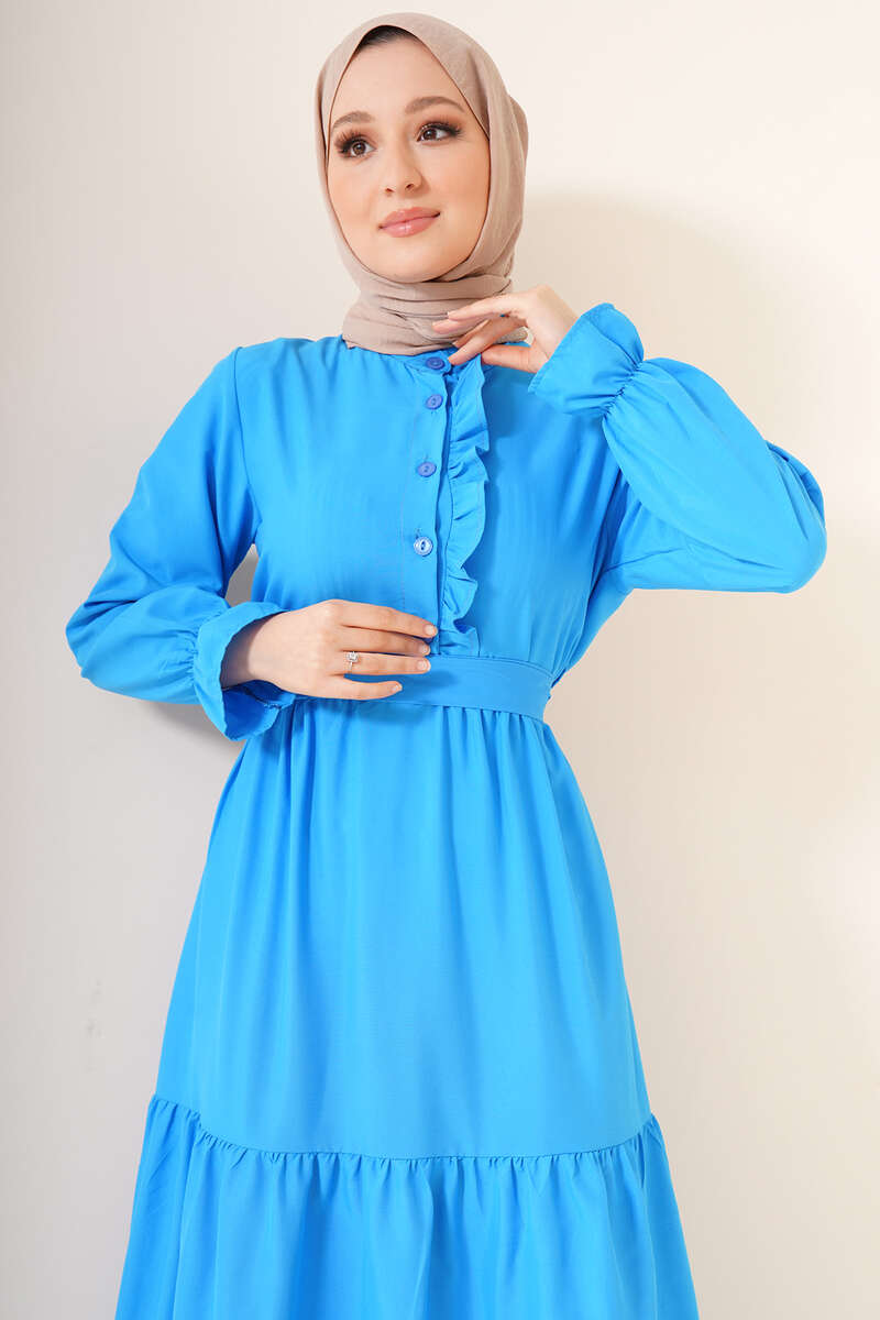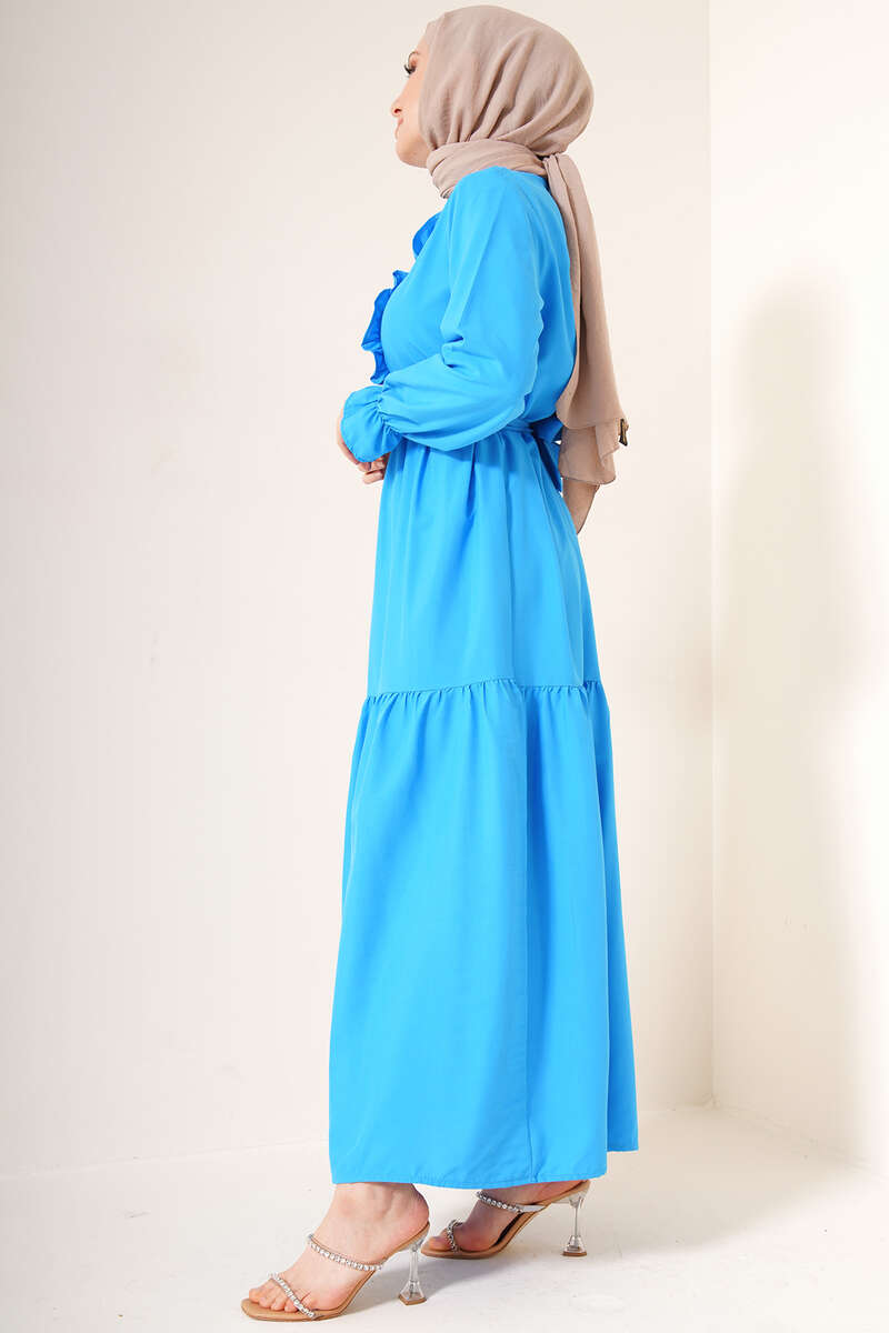 Yeni sezon elbisemiz hakim yakadır. Göğsünde bulunan düğmelerine fırfır detayları eşlik etmektedir. Beli kuaşklı olan elbisemizin iki adet kemer köprüsü bulunmaktadır. Kat kat model olan elbisemizin bilekleri lastiklidir.