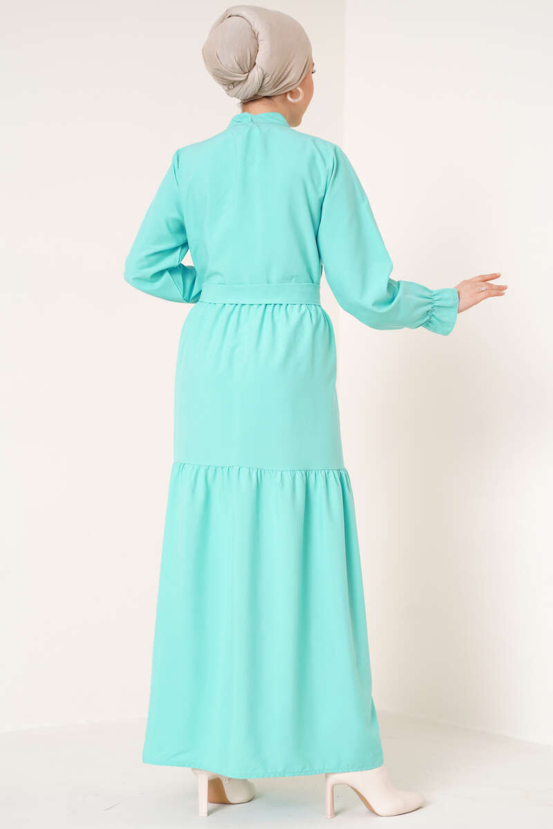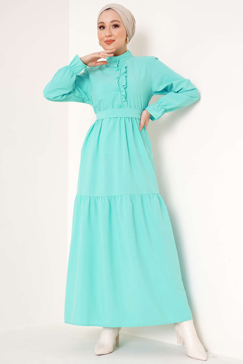 Yeni sezon elbisemiz hakim yakadır. Göğsünde bulunan düğmelerine fırfır detayları eşlik etmektedir. Beli kuaşklı olan elbisemizin iki adet kemer köprüsü bulunmaktadır. Kat kat model olan elbisemizin bilekleri lastiklidir.