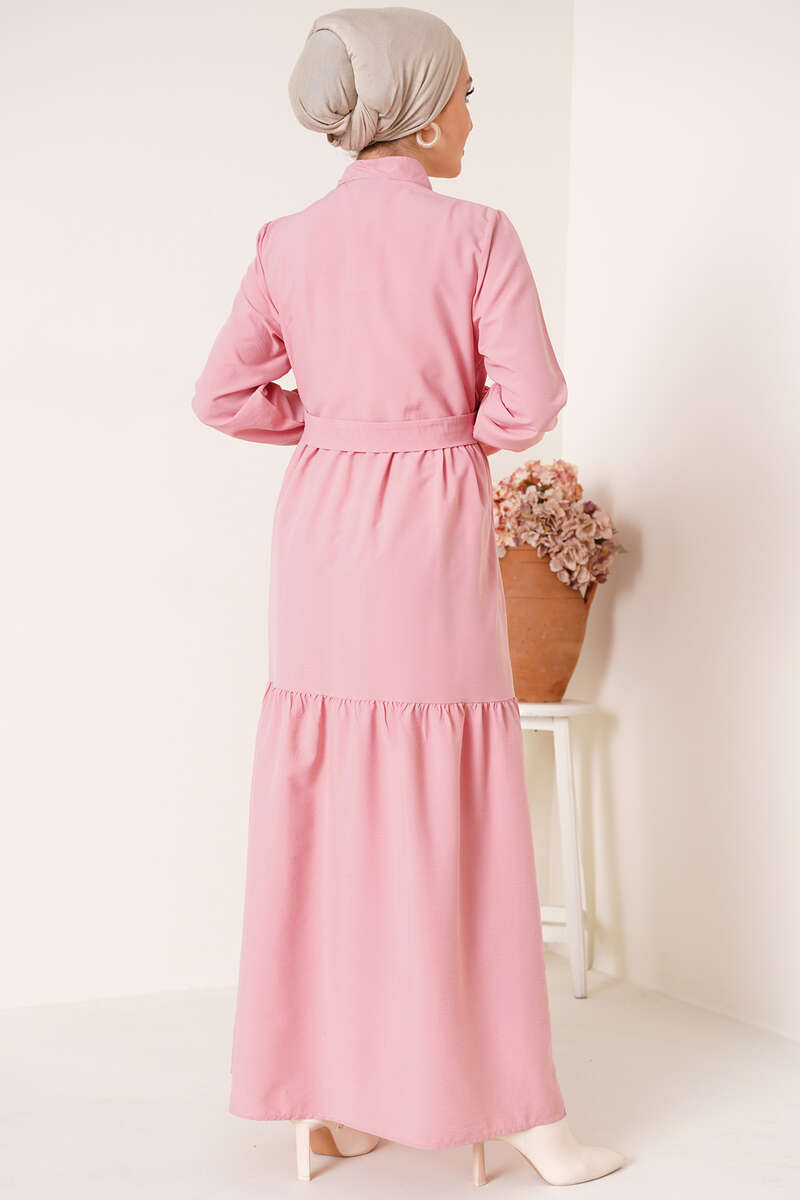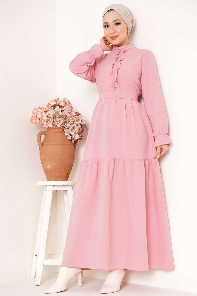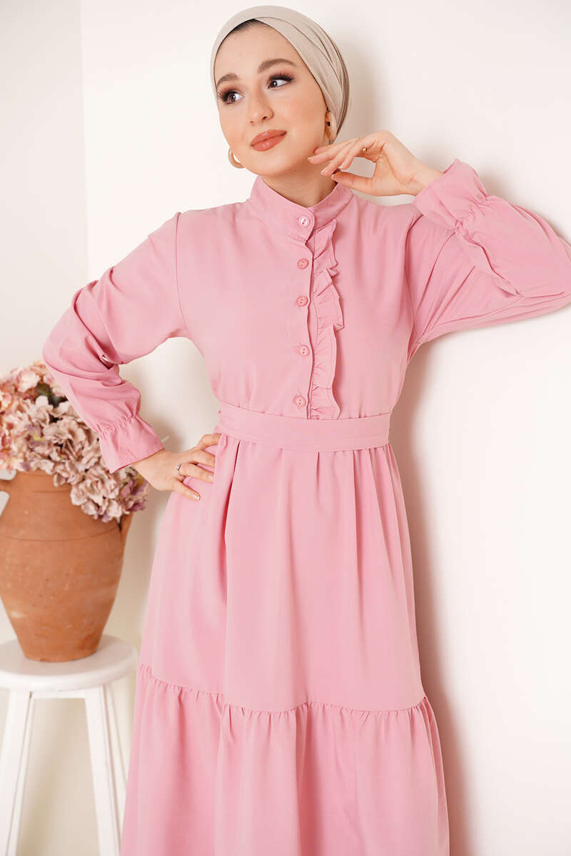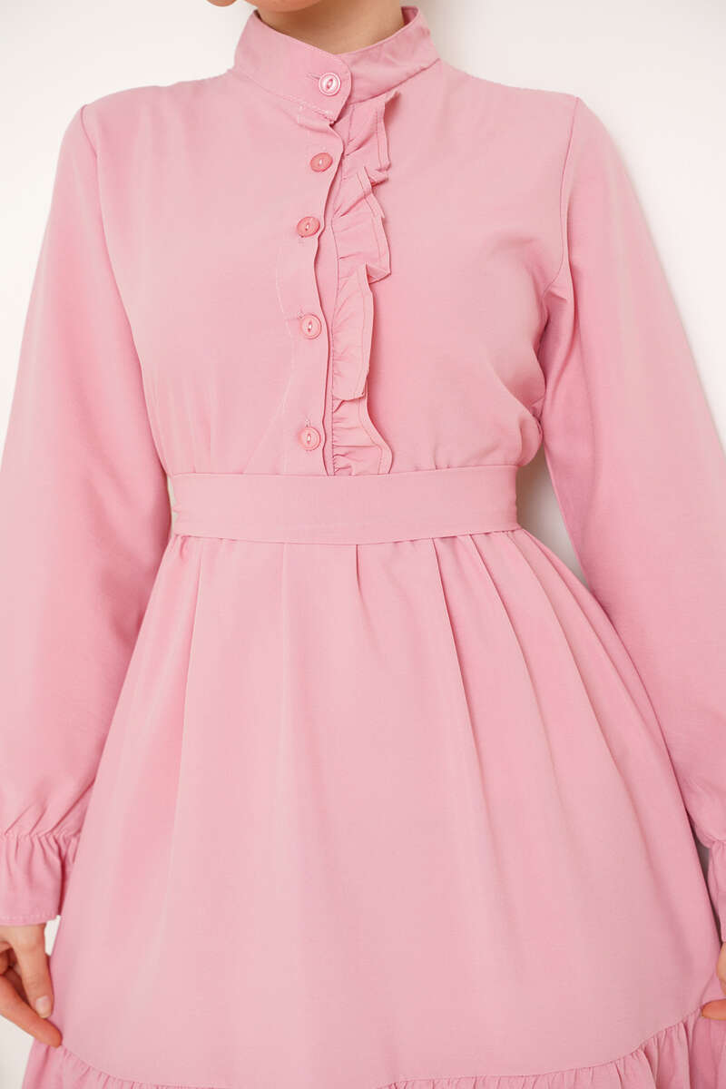 Yeni sezon elbisemiz hakim yakadır. Göğsünde bulunan düğmelerine fırfır detayları eşlik etmektedir. Beli kuaşklı olan elbisemizin iki adet kemer köprüsü bulunmaktadır. Kat kat model olan elbisemizin bilekleri lastiklidir.