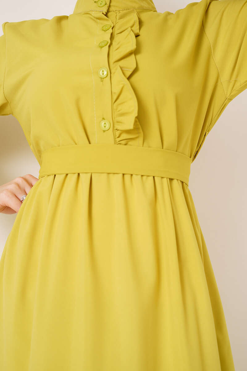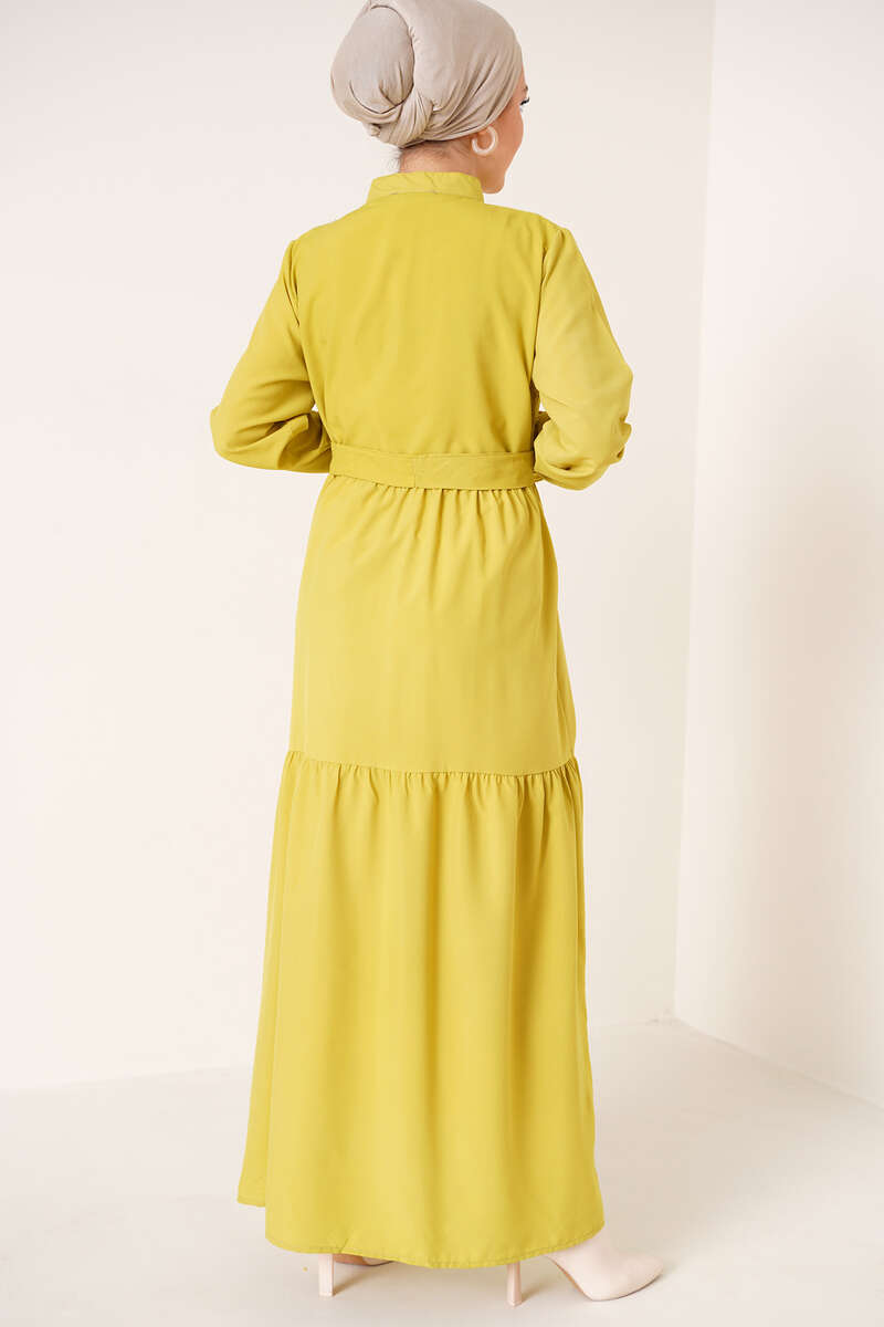 Hakim Yaka Kuşaklı Elbise Yağ Yeşili