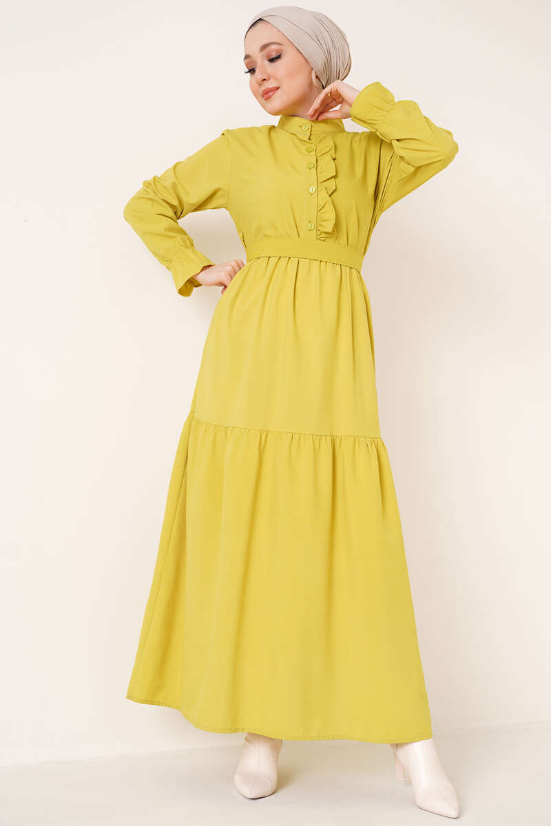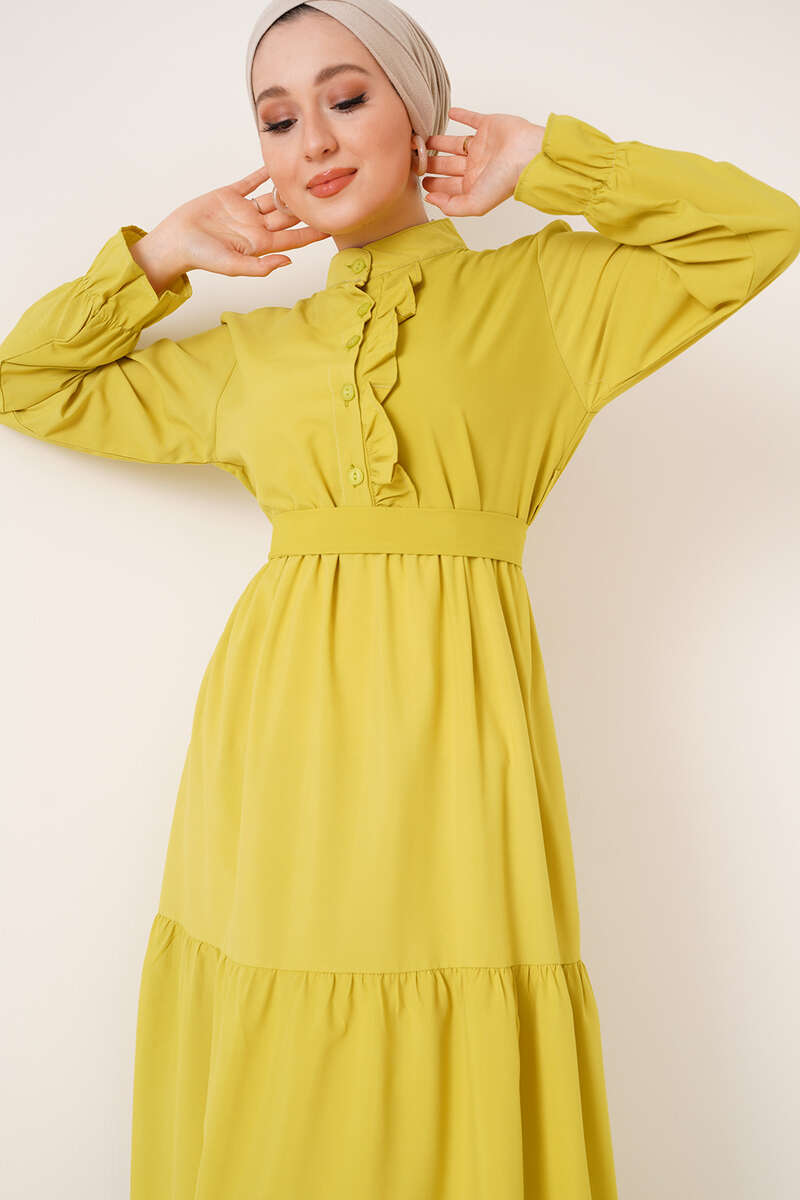 Yeni sezon elbisemiz hakim yakadır. Göğsünde bulunan düğmelerine fırfır detayları eşlik etmektedir. Beli kuaşklı olan elbisemizin iki adet kemer köprüsü bulunmaktadır. Kat kat model olan elbisemizin bilekleri lastiklidir.
