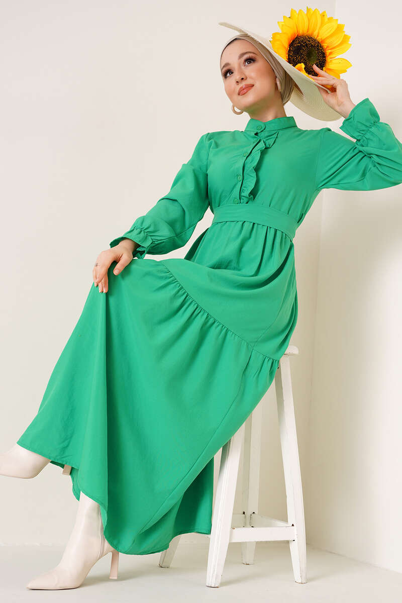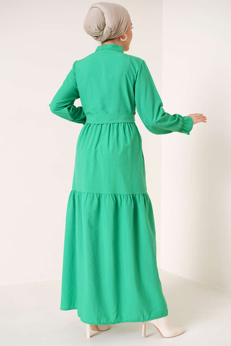 Hakim Yaka Kuşaklı Elbise Yeşil