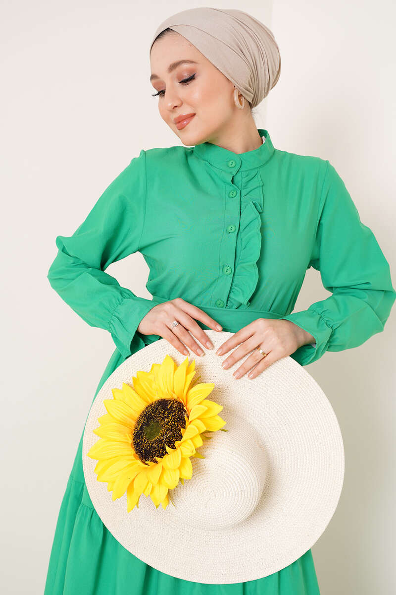 Yeni sezon elbisemiz hakim yakadır. Göğsünde bulunan düğmelerine fırfır detayları eşlik etmektedir. Beli kuaşklı olan elbisemizin iki adet kemer köprüsü bulunmaktadır. Kat kat model olan elbisemizin bilekleri lastiklidir.