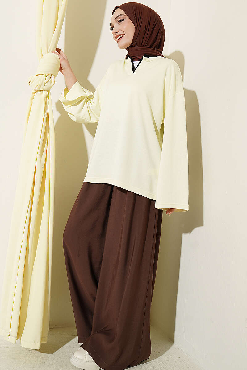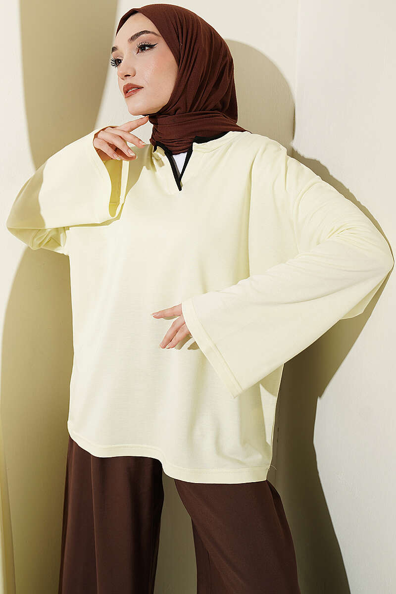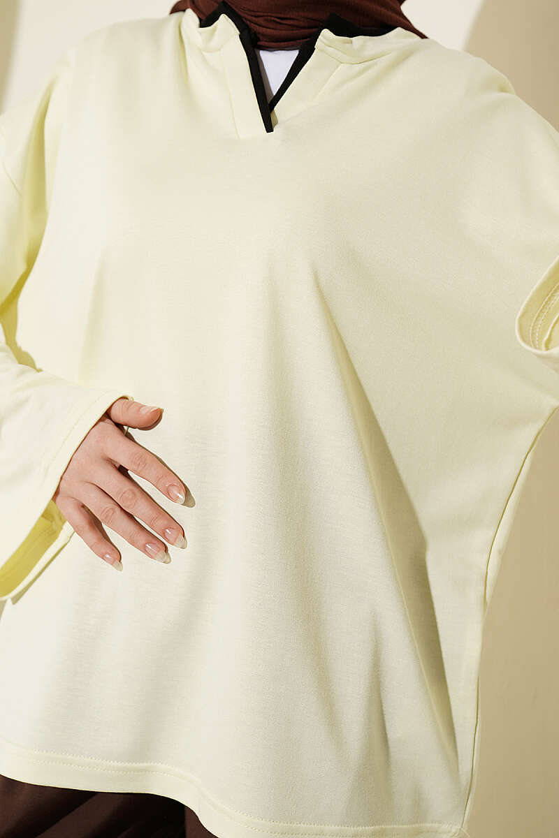 Bu tunik, hakim yaka tasarımı ve minimalist çizgileriyle modern tesettür giyimin en konforlu parçalarından biri olarak öne çıkar. Düşük omuz yapısı ve dökümlü kesimi sayesinde gün boyu hareket özgürlüğü sunarken, sade dokusuyla zahmetsiz bir şıklık vadeder. Boyun kısmındaki zarif dekolte detayı, klasik tunik formuna yenilikçi bir dokunuş katarak hem spor hem de günlük kombinlere kolayca uyum sağlar. Yumuşak kumaş dokusu ve zamansız tasarımıyla gardırobunuzun en işlevsel ve rahat parçalarından biri olmaya adaydır.
